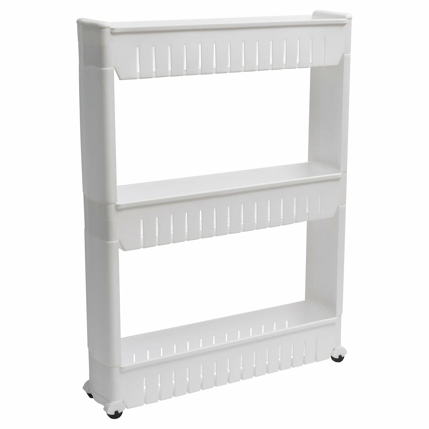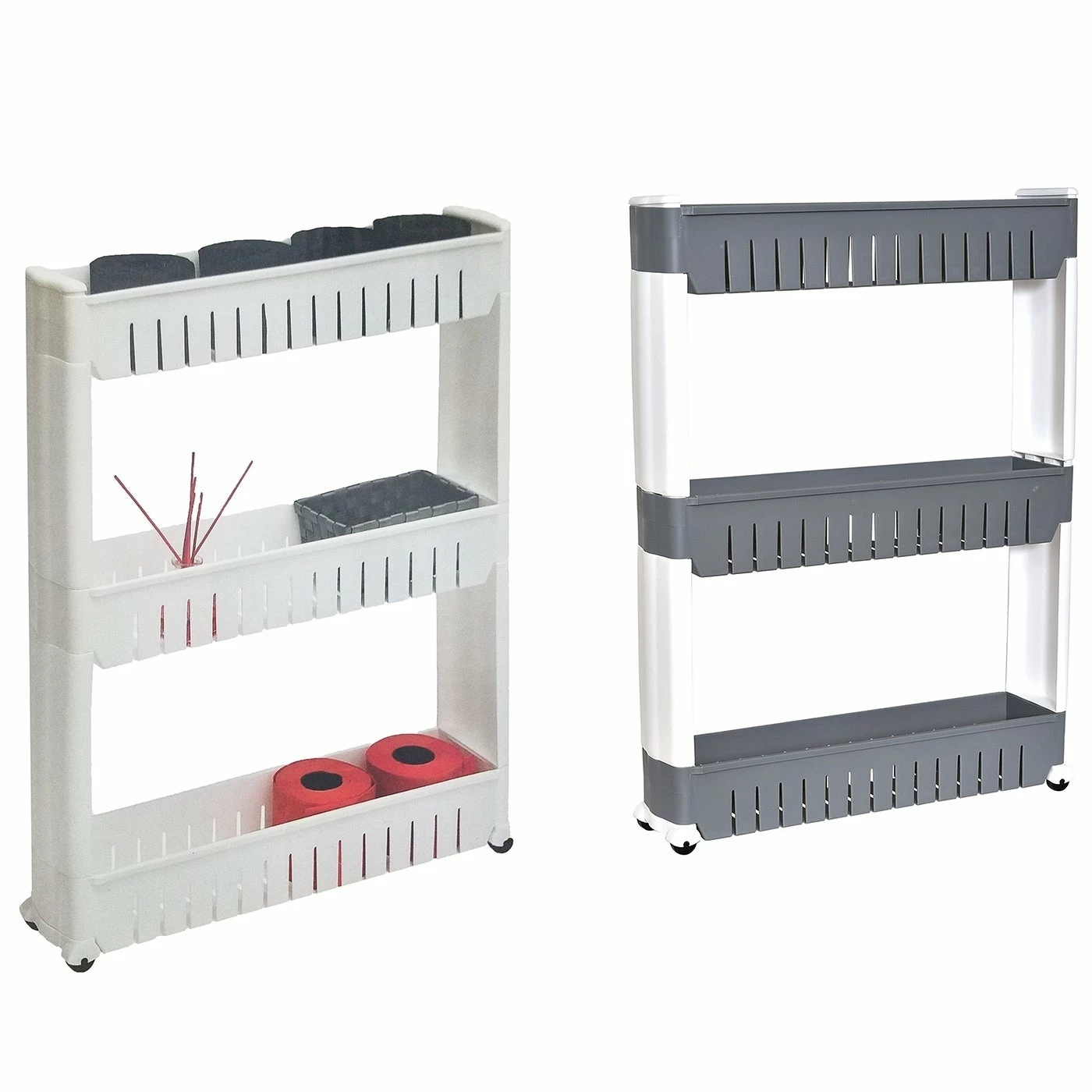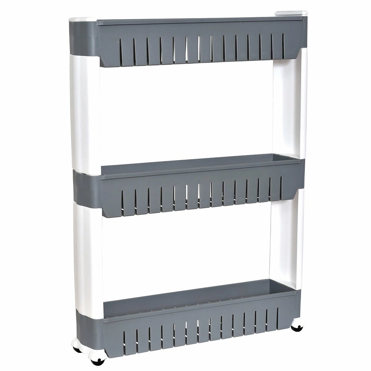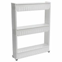 Turn tight spaces into discreet storage! Slim storage cart with wheels easily slides in between a refrigerator and cabinet to organize pantry items, or between your washer and dryer to store laundry supplies. This 3 shelves rolling cart is ideal for keeping tissue and more within easy reach in a bathroom, too! Three shelves each hold up to 60 lbs. 4 smooth-rolling casters easily glide on any surface. Easy assembly : simply snap together. Dimensions 28.3″ H x 21.3″ L x 5.1″W (72 x 54 x 12 cm). Rolling storage cart made with durable plastic. Color white or white and gray. Imported from France, made in PRC. Shelves are non adjustable, easy to clean with a damp cloth. Store your supplies and display them neatly on this 3-tier cart, this white plastic Polypropylene cart is convenient to move around and can be placed in any corner of the room with ease.