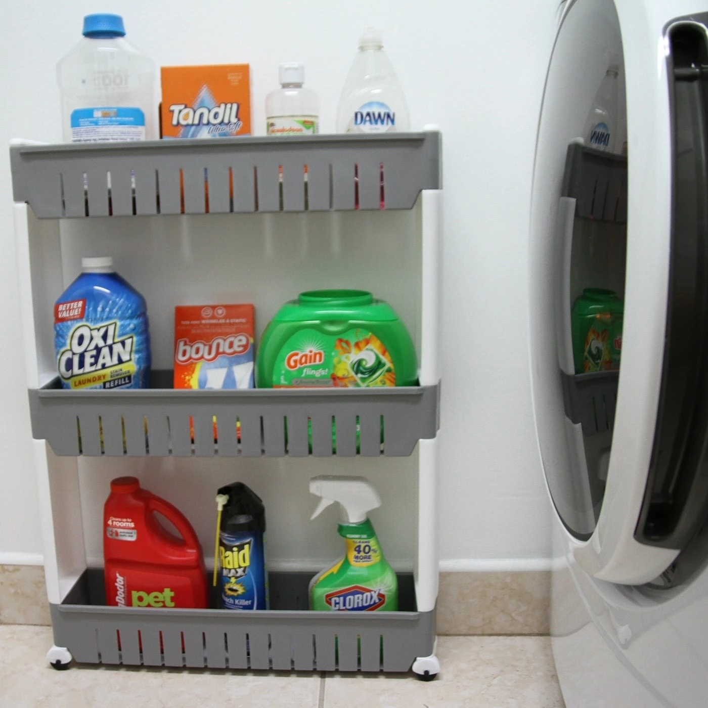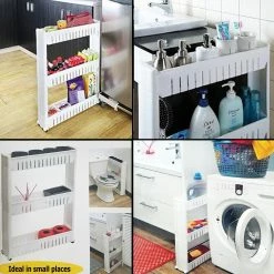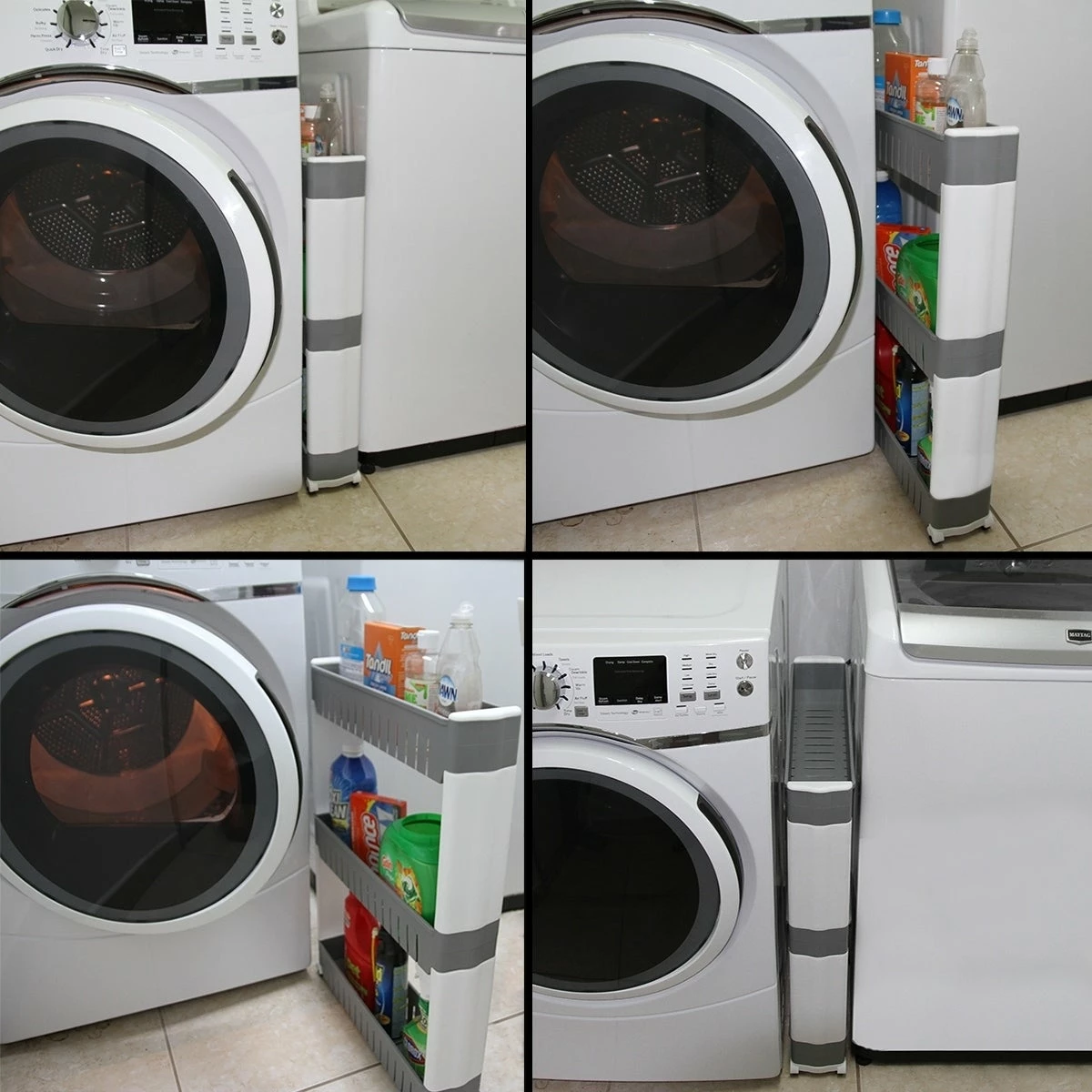 - 3 TIER SPACE SAVER STORAGE TOWER: This utility cart can easily slide out of any narrow space in your kitchen, laundry room or bathroom and provides ample storage space for items. Its compact design fits great between washer and dryer, the perfect way to utilize tight spaces in your home for storage and organization