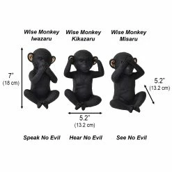 This gorgeous set of 3 Wise Monkeys Speak Hear See No Evil Resin Black Gold will bring your decor to the next level with its zen-like style and design. It will create peace and harmony to your home or be a unique gift for friends and family. Once you place them on a clean table or shelf, people will automatically witness the statues, feel at ease, and consider you a peaceful or wise person. Use them as bookends, mantelpiece ornaments, center table pieces, side table embellishments. Also nice as garden adornments in your home, office or studio. Our decorative statues are made of durable resin and are crafted with great attention to detail. Choose from our 3 wise monkeys, our elephants or our Buddha head statuette. Without a doubt, Evideco’s statuettes are clearly designed to bring wisdom and serenity in your home. Not only, this 3 mystic apes statuettes set is a nice gift on Mother’s day, Christmas, Valentine’s day. But also as a House warming present or in any other situation you wish to offer luck and prosperity. Indeed, it’s just the ideal object to show someone you love, how much he or she means to you. These Wise Monkeys Speak Hear See No Evil figurines symbolize prudence, self-discipline, humility and self-control. Evideco is your source for the perfect decorative bathroom accessory options to personalize your one-of-a-kind space.”