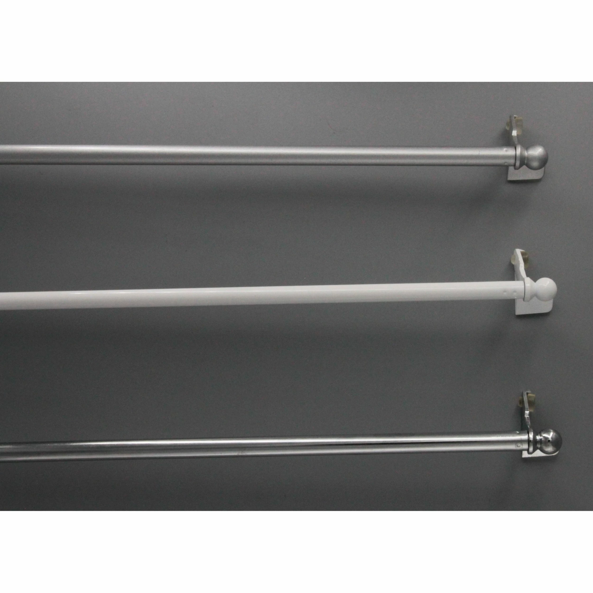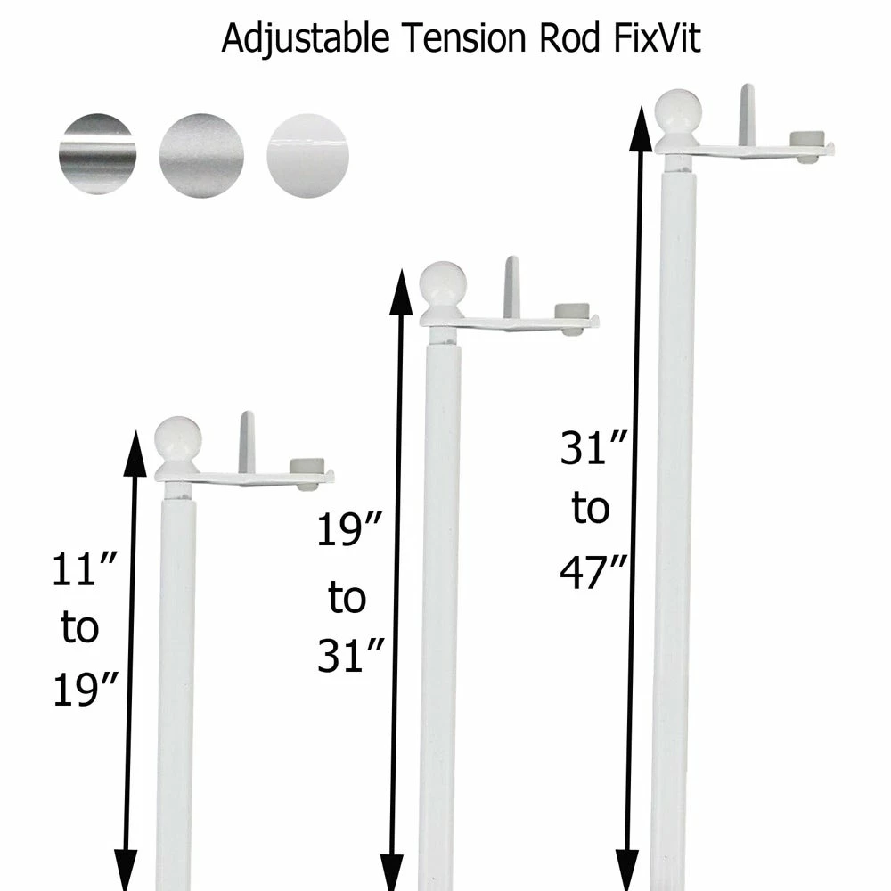 Bring an extra flourish to your window voilages with this extendable tension rod FixVit, diameter 0.5 inch, adjustable from 11 to 19 inches (30-50 cm), perfect for holding your pretty valances and tiers. This adjustable curtain rod can be installed quickly, easily and it’s gentle on walls, no drilling, screws, or tools are required. Speedy round shape extendable rod is endlessy repositionable and can be set up on any kind of windows (PVC, alu, wood). Twist the rod entirely and slide your curtain on the rod then adjust the length and lighty press both ends. Place the rod against the window frame and cling both side parts against the window frame. Features a versatile white powder coated metal finish to match a variety of home decor styles. For right angle or beveled window frame, remove the rubber pad placed between the seal and the window frame. Available in many sizes : 11 to 19 inches (30-50 cm), 19 to 31 inches (50-80 cm) or 31 to 47 inches (80-120 cm). Universal patent. Color white also available in silver or chrome, diameter 0.5 inch also available in 0.6 inch. This sheet rod is imported from France and made in PRC. This telescoping self blocking bar makes hanging net and sheer drapery a breeze.