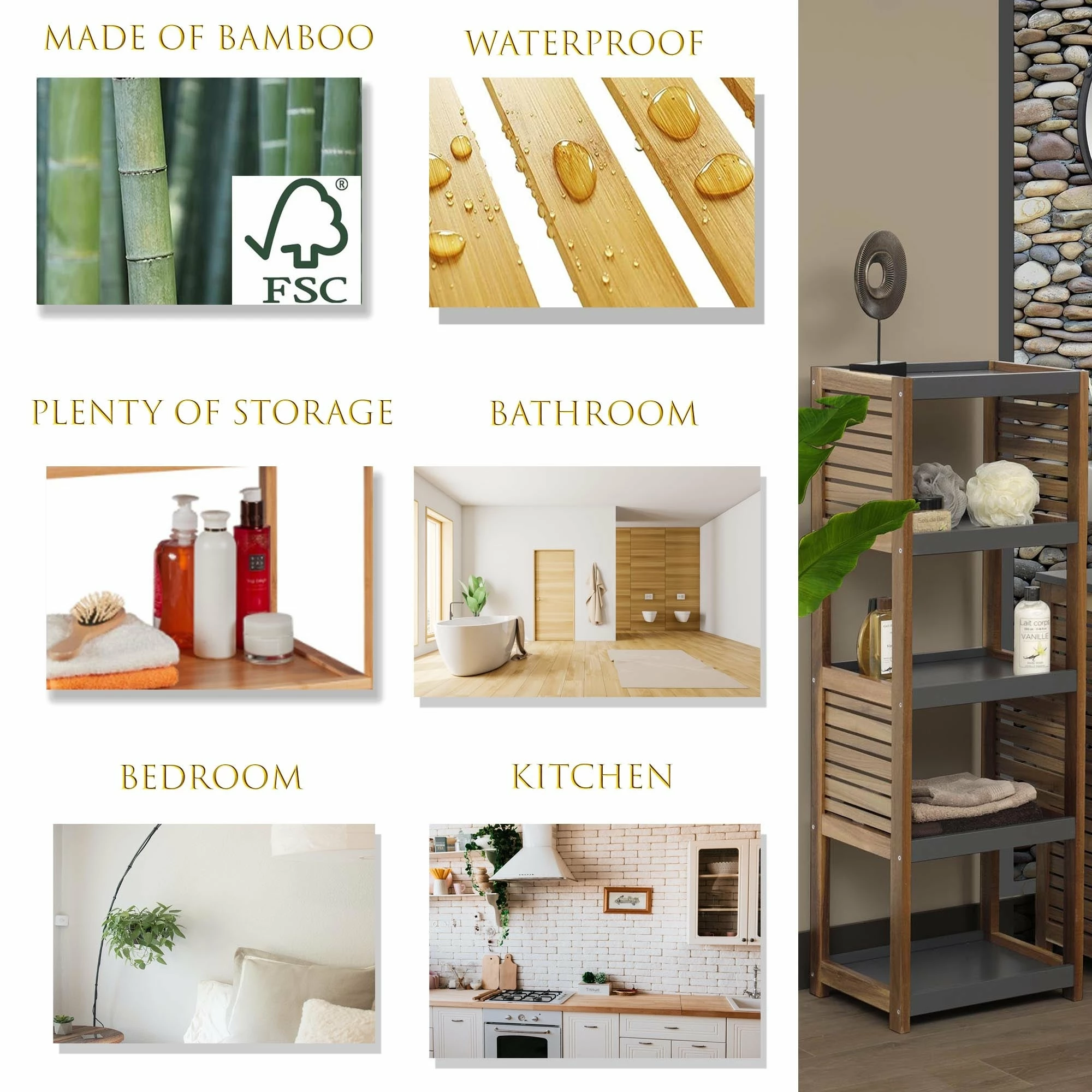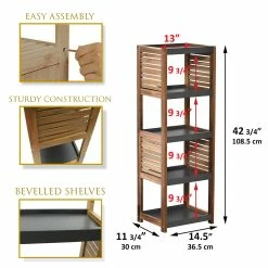 - MADE OF BAMBOO/MDF: Frame and door are made of laminated acacia with a natural finish, it breathes simplicity, authenticity and character. 5 gray tiers are made of wood (MDF).Acacia is a natural material and may have some color shades and variations