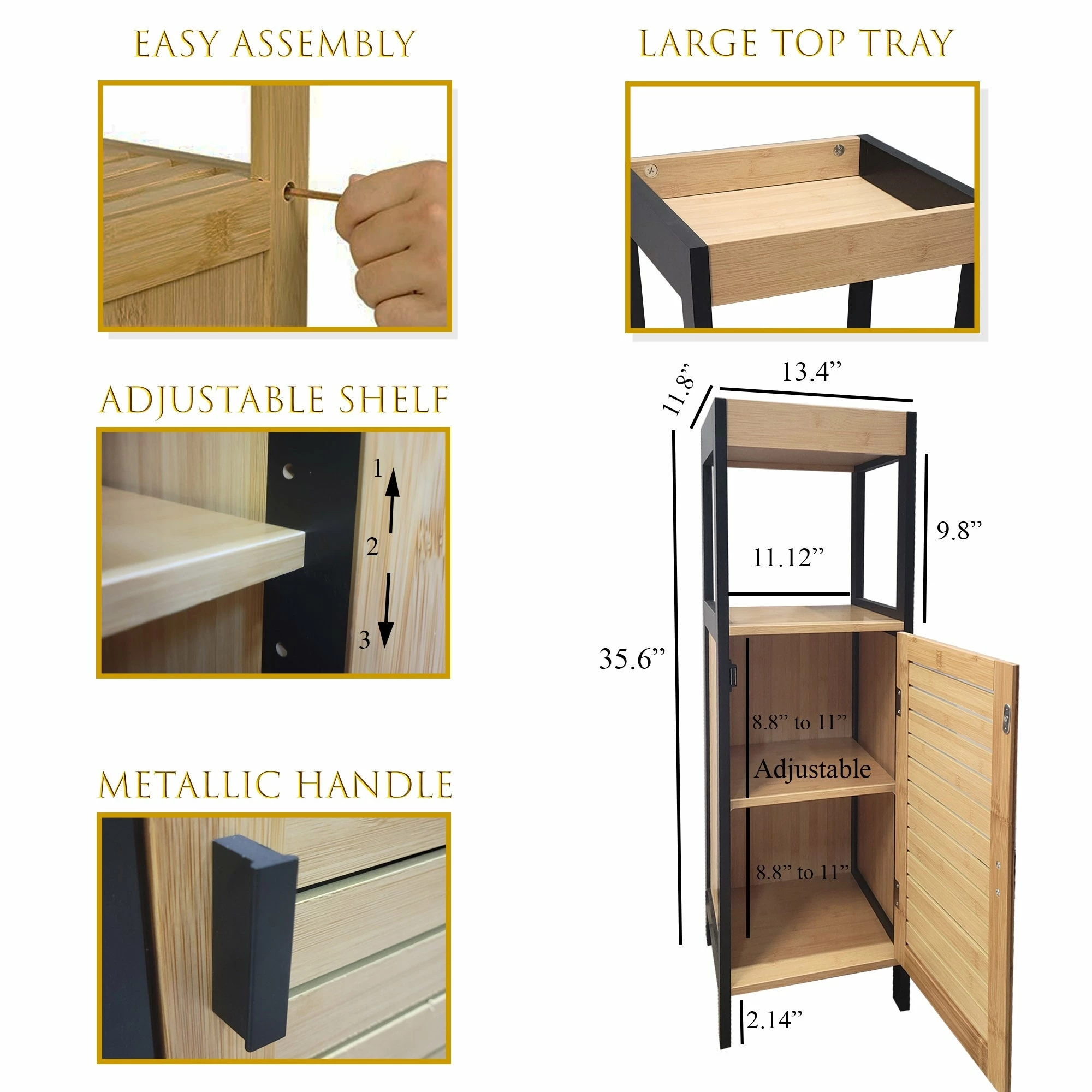 - MADE OF BAMBOO/MDF: Sides, louvered door and shelves are made of bamboo, it breathes simplicity, authenticity and character. The black frame is made of wood (MDF), black metal handles