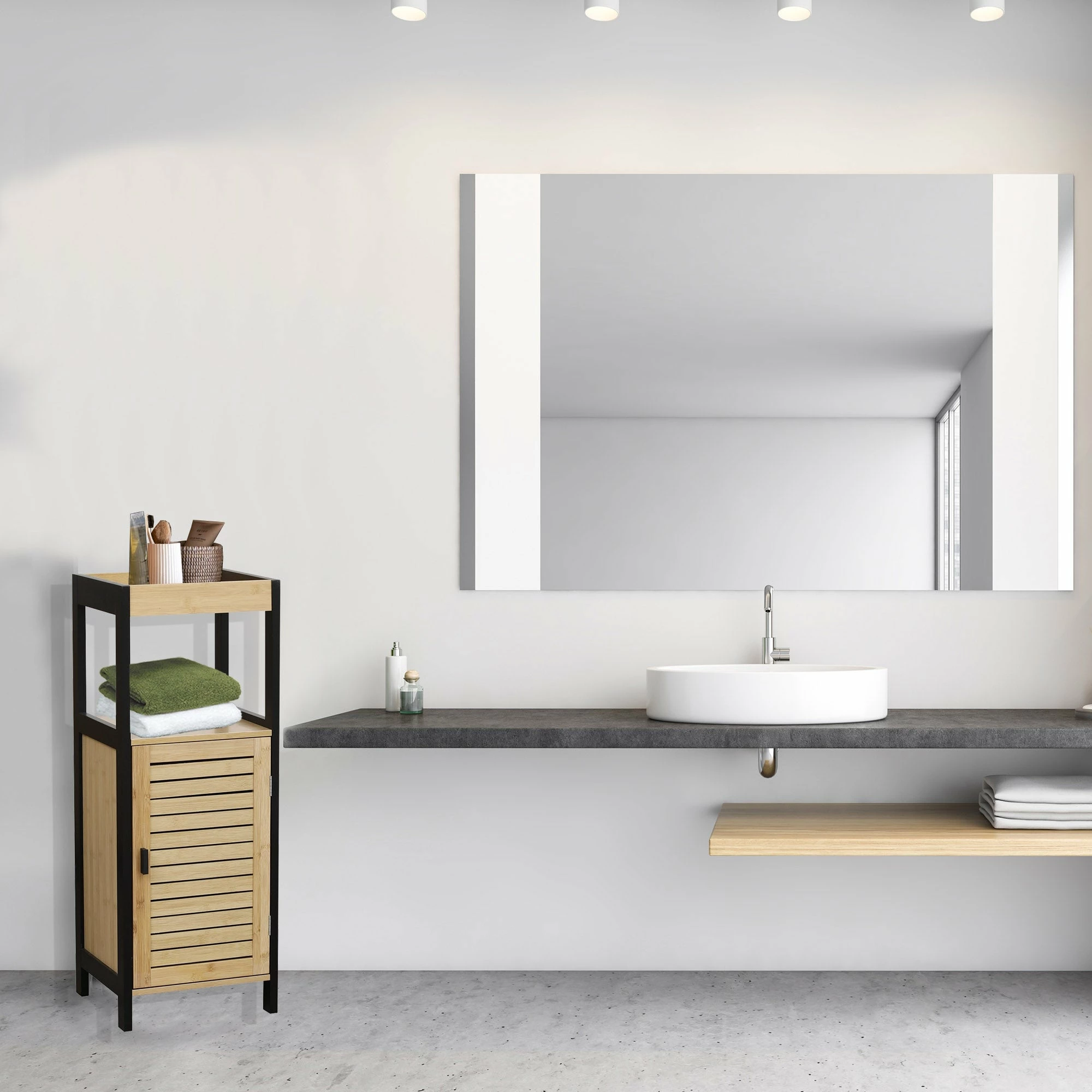 Keep a perfectly organized bathroom and make the best use of limited space with some attractive bathroom storage solutions. This floor cabinet bamboo and black Cebu features 1 closed cabinet that offer plenty of space for your bathroom accessories. It’s a storage option that is easy to relocate. Typically designed to slide against a wall, or to tuck neatly inside a corner. This bathroom medium tower is a common choice for people looking to integrate some storage space into their bathroom. Also great for keeping items off the floor and at hand reach. Also an ideal option for holding towels and other accessories without taking up much floor space. Perfect to store and dispense toilet paper rolls and to provide an elegant addition or modern look to any bathroom. Finally, revamp and organize your bathroom with our floor cabinet Cebu 1 door