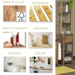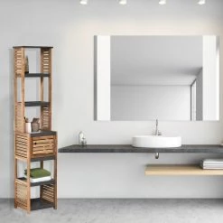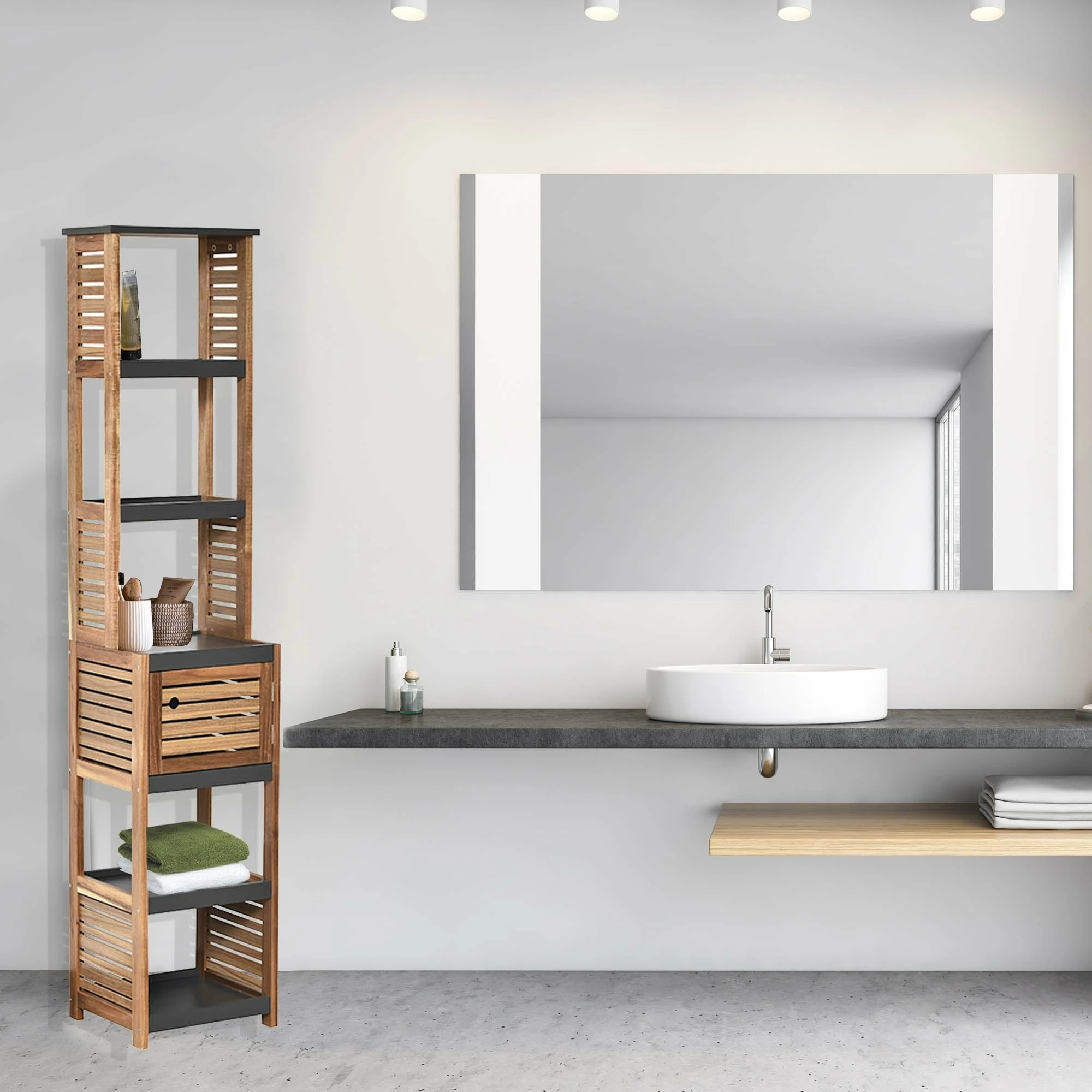 In small-size bathrooms or even in any bathroom, no space should go to waste. This freestanding bath linen tower cabinet Elements 1 door 5 storage alcoves is the perfect storage solution. Keep a perfectly organized bathroom and make the best use of limited space with this attractive bathroom furniture. This tower cabinet with five open shelves and one closed cabinet offers plenty of space for all your bathroom accessories. This bathroom cabinet is made of Acacia and gray-painted wood (MDF), the door is magnetized to stay securely closed. Moreover, this tall linen cabinet is ideal for keeping your toiletries right at your fingerprints without sacrificing valuable floor space. Not only perfect to display decorative items or to store towels, knick knacks and toilet paper rolls. But also ideal as a storage option that is easy to relocate. Indeed, it’s typically designed to slide against a wall, or to tuck neatly inside a corner. To sum up, this freestanding bathroom storage cabinet Elements provides an elegant and modern look to any bathroom. Finally, complete your decoration with other products of the same collection Elements. In addition to your cabinet, you can add under sink, floor or over-the-toilet cabinets, toilet paper reserve or tower unit.