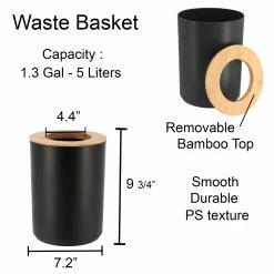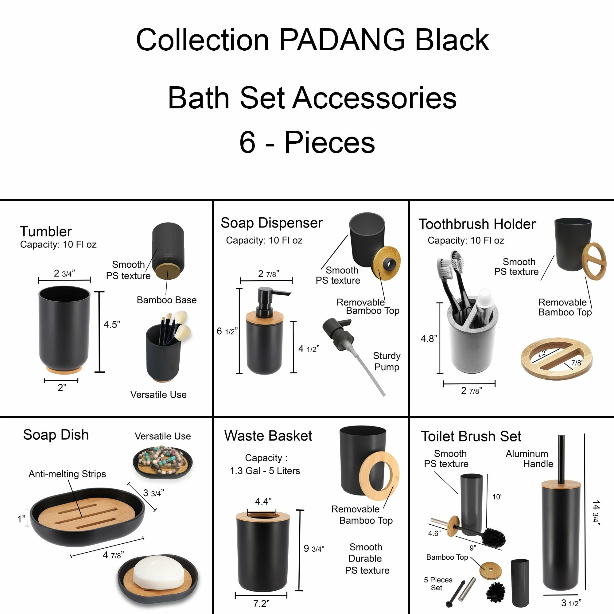 Grace your bathroom vanities with a classical but contemporary style using this black Padang bathroom accessory set 6-pieces bamboo. Β If your bathroom counters look a little cluttered, you may need to upgrade your space with these bathroom accessories. Stop throwing your bathroom essentials all over the counter and use one of these convenient sets instead. Β Brighten the bath with the light and luxe look of this spa-worthy accessories collection. Clearly, it will blow a fresh wind to your bathroom, kitchen, laundry or for your vanity. Β A collection of useful holders, trays and organizers makes getting through morning and evening routines joyful and easy. Our set can feature a soap dispenser, toothbrush holder, tumbler, soap dish, trash can, and toilet brush. Β Our bathroom accessories sets offer style and dΓ©cor, no matter what design you love. Plus, they’re durable and made with easy-to-clean materials such as plastic, ceramic, and stainless steel that won’t rust after use. Β In short, our bath accessory set will complete your new bathroom look in seconds. But also, it will allow you to neatly arrange your bath essentials with style. Β Enjoy this black Padang bathroom accessory set 6-pieces bamboo to freshen up your countertops.”
