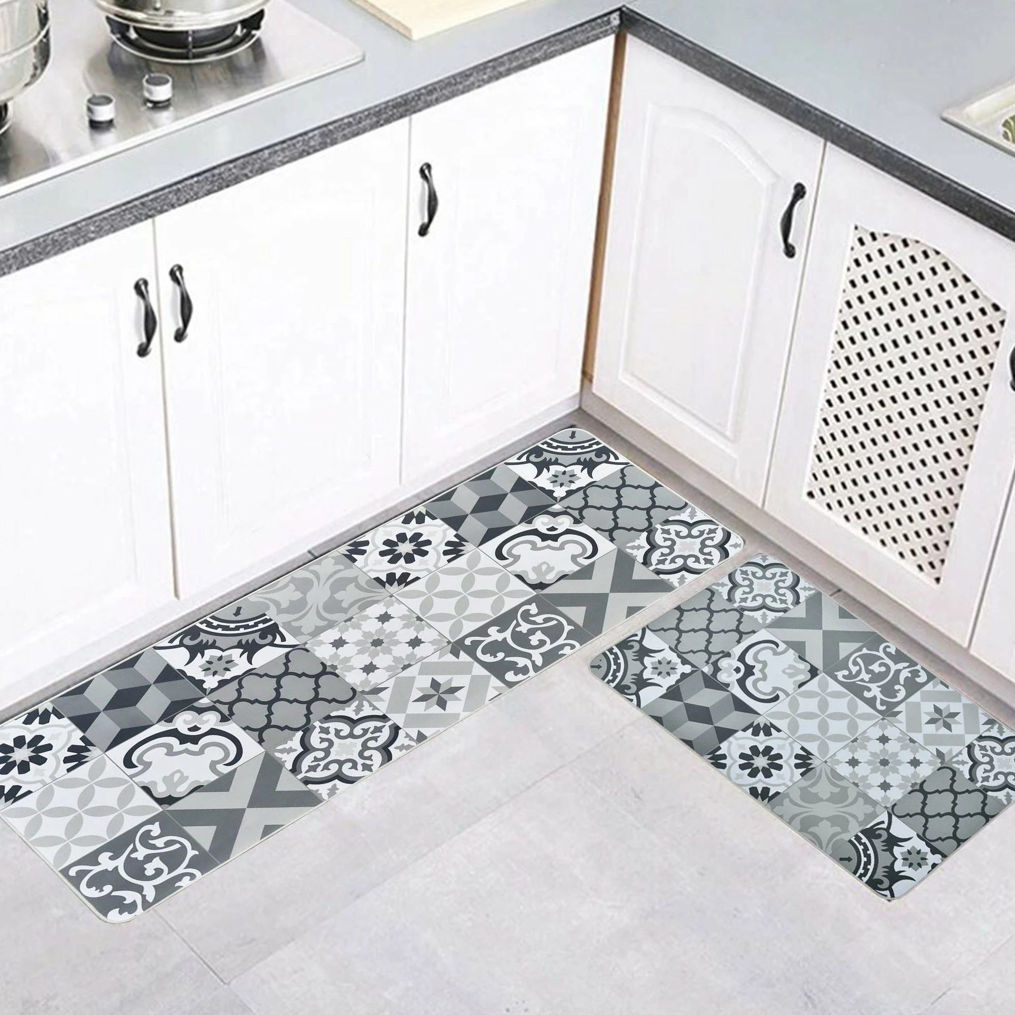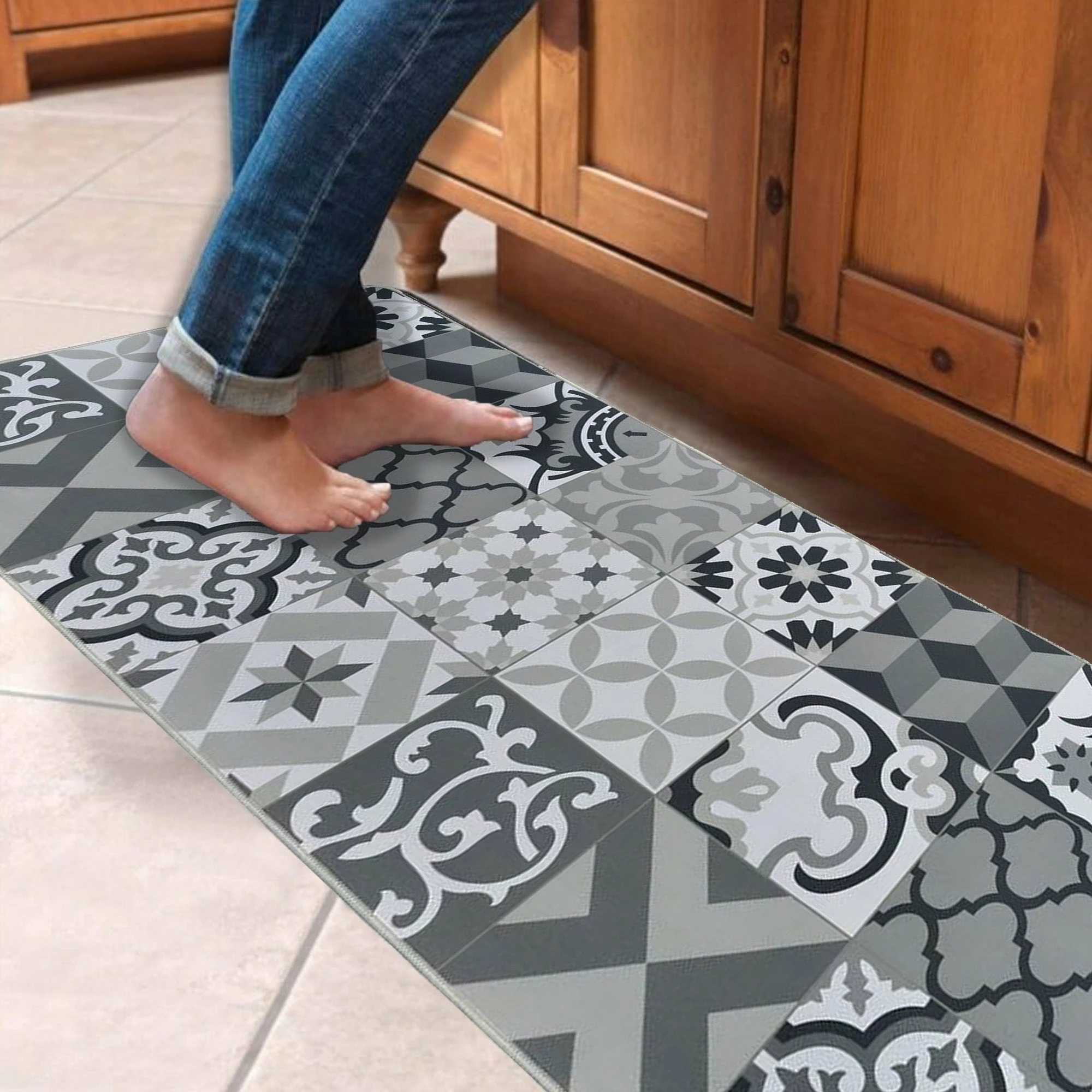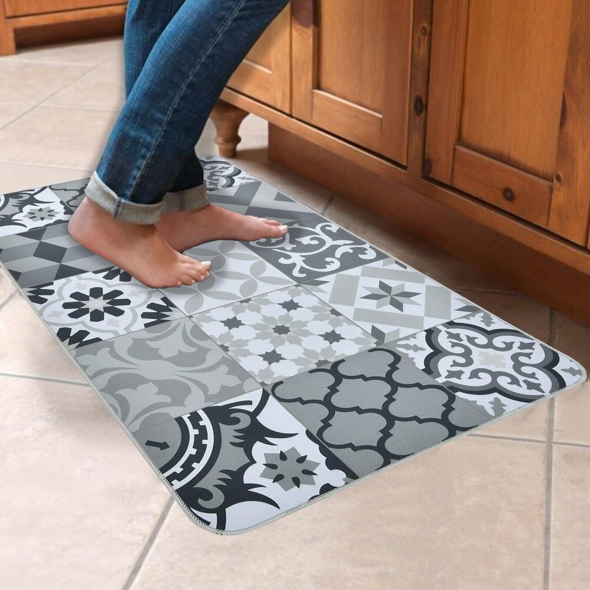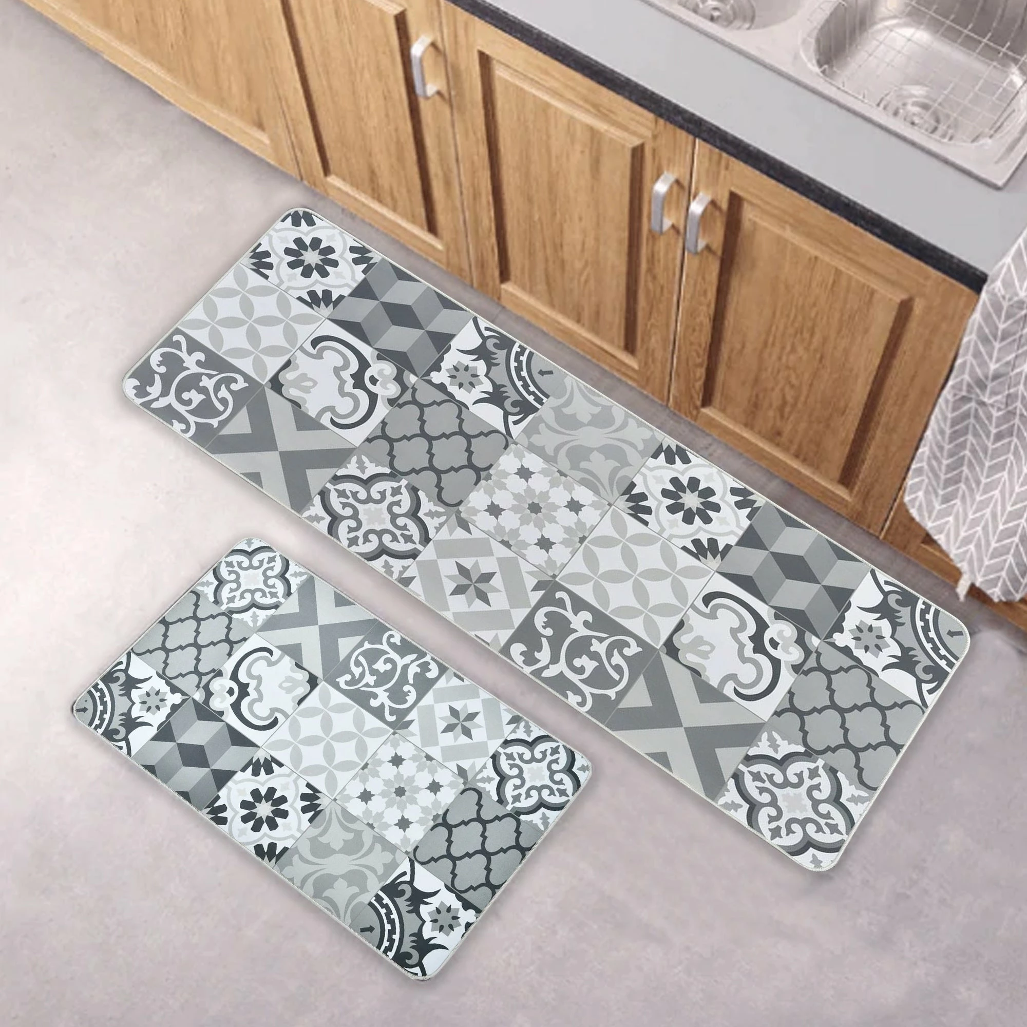 - ATTRACTIVE DESIGN: This floor kitchen mat features a cement tile effect at the forefront of the trend. Its bright and harmonious colors will enhance your interior and make it the centerpiece of your space. Our sink mats match any house decoration with different styles