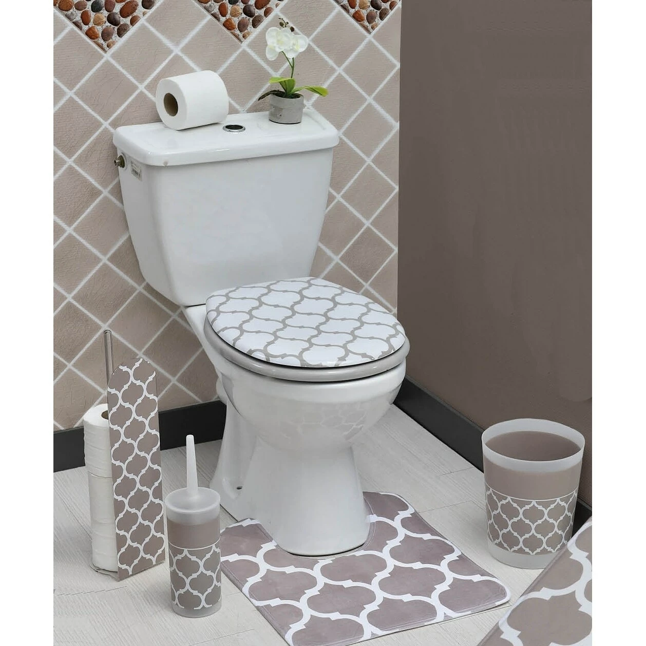 A new way to hide your toilet rolls with style! This Escal printed toilet tissue holder reserve is made of clear acrylic featuring a geometric pattern which adds sophistication to your bathroom. Store your spare rolls of toilet tissue in a fashionable way with this attractive floor-standing holder. It holds four rolls of toilet tissue with a round stable base of 5.12-Inch diameter, 18.9-Inch Height (Rolls are sold separately). Wipe clean with a damp cloth. Imported from France, made in PRC. Color: opaque taupe.Complete your decoration with other products of the same collection Escal, like shower curtain, bath mat, tumbler, toothbrush holder, trash can, toilet seat or toilet brush to name a few.