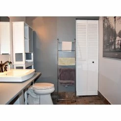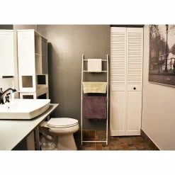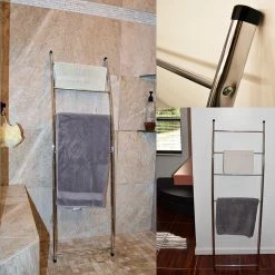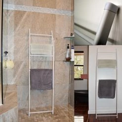 Need extra storage and a neat bathroom? Wet towels and bathrobes hanging over the tub edge or the shower rod create a very untidy look in the bathroom. They just don’t dry right unless they are hung up. Evideco bathroom towel hangers, ladders, hooks, and door hangers for towels will give you a dry towel the next time you need one. There is the added bonus of hooks acting as extra storage for a towel. If there’s no room for a robe in the closet, you can hang it on a hook. Evideco offers a large array of quality towel holders and hangers in a variety of designs and styles to match your home dΓ©cor and your own style. Choose from a freestanding towel rack tree, towel valet stand, wall mounted hooks, over-the-door hooks and racks or wall mounted shelves. Keep towels, robes, and other clothing off the floor and out of the way in the bathroom with towel hangers. Keep everything organized, neater and, most importantly, dry! Hangers and shelves for wet towels will help them dry faster and air them out.