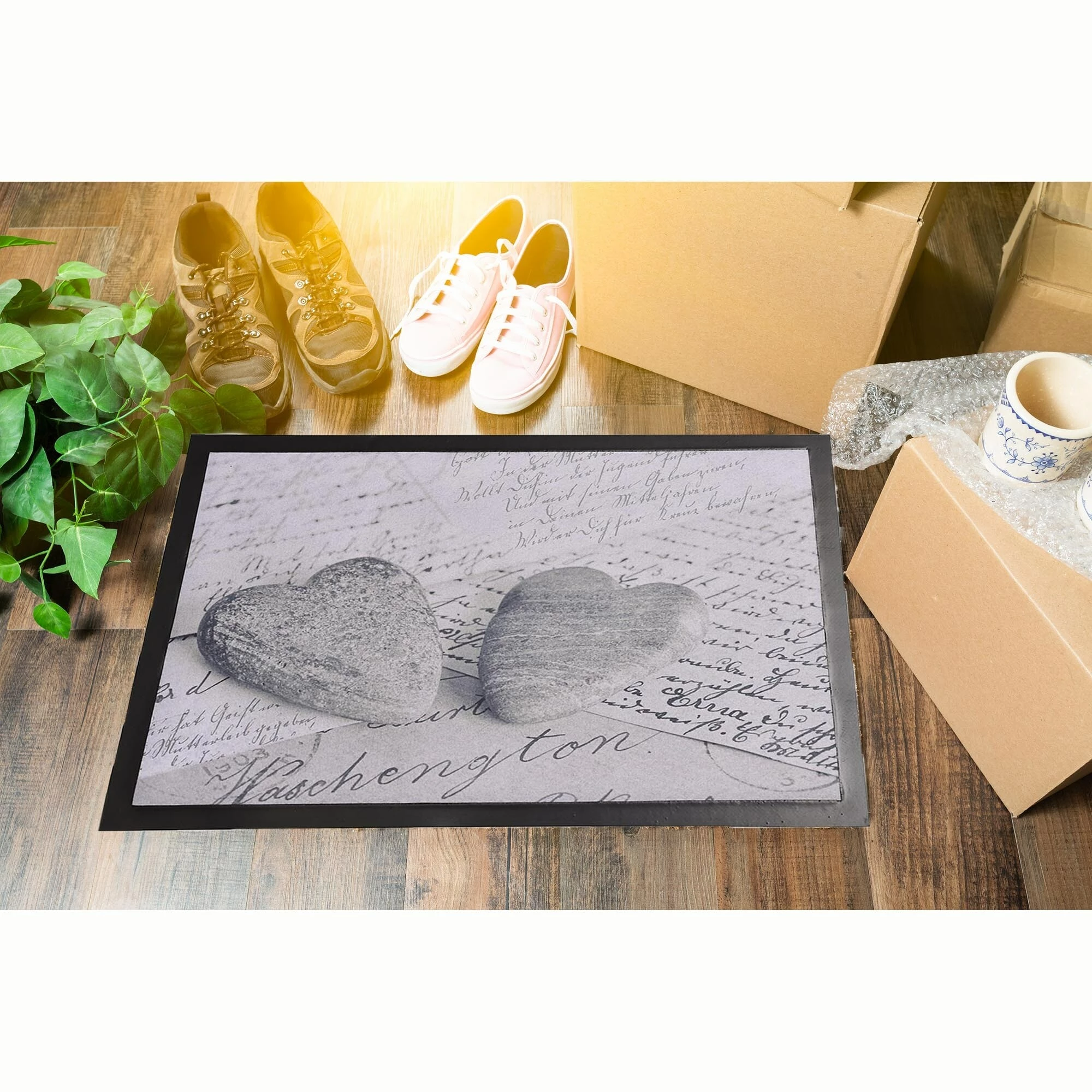 If you are looking for an effective way to prevent dirt, grit and moisture from entering into your house, this elegantly Homdkor indoor mat is the only answer. This door mat features a richly textured printed design of two lovely heart-shaped stone- that is fade and weather resistant. Our indoor entrance mat is made of heavy duty combination of polyester and PVC and meets the industry highest standards to tolerate heavy foot traffic. Featuring hydro-locking fibers to quickly absorb moisture, it allows guests to wipe off grime and dirt from their shoes, it’s functionnally effective but also improves aesthetics in place with its beautiful printed design. With its unique anti-slippery recycled PVC structure backing, it prevents moisture from passing through and reaching the floor and ensures also a high level of safety. Its floor-hugging design will keep it from snagging on swinging doors. The adjacent gutter around perimeter forms a dam for dirt – prevent them from spreading on the floor. Widely used for every room of your house, it’s a creative accent rug in any foyer. Stain resistant, to clean it, simply sweep, shake or vacuum to easily remove dirt and dust, machine washable 92 F (30 C). Manufactured in PRC, imported from France. Dimensions : 24″L x 16″ W x 1/16″H (60 L x 40 W cm). Color grey and beige. This distinctive printed design waterproof home rug is a work of art that will add a welcoming touch to any room or home entrance way.