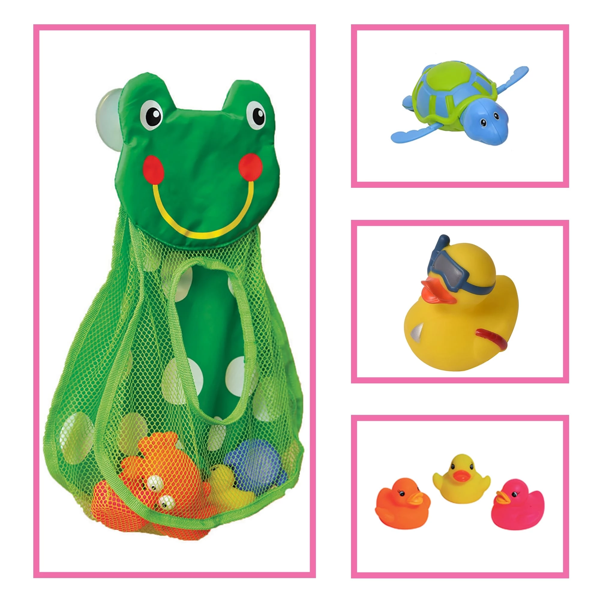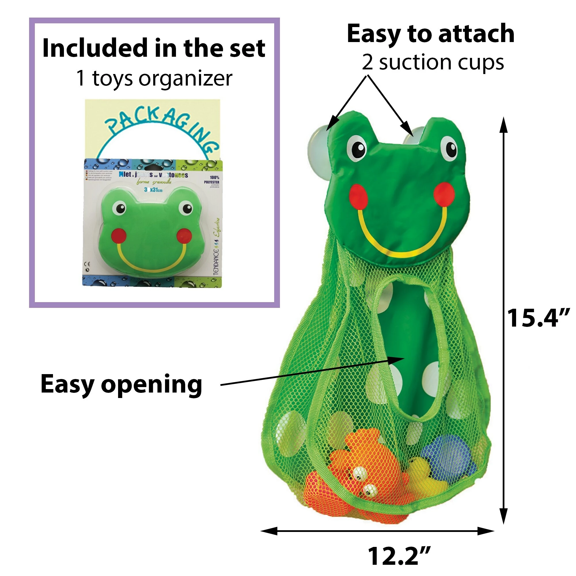 - TOY ORGANIZER: Playful green frog mesh bag with easy opening and 2 suction cups for easy attachment. With dimensions of 15.4″ L x 12.2″ W, this toy bag is big enough to hold all of your child’s toys and keep your bathroom clean!