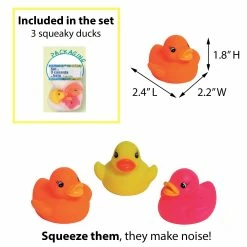 - SQUEAKY DUCKS: This floating set of 3 colorful duckies is perfect for bathing time. Bright orange, yellow and pink, these rubber ducks make sound when you squeeze them! Dimensions: 2.4″ L x 2.2″ W x 1.8″ H