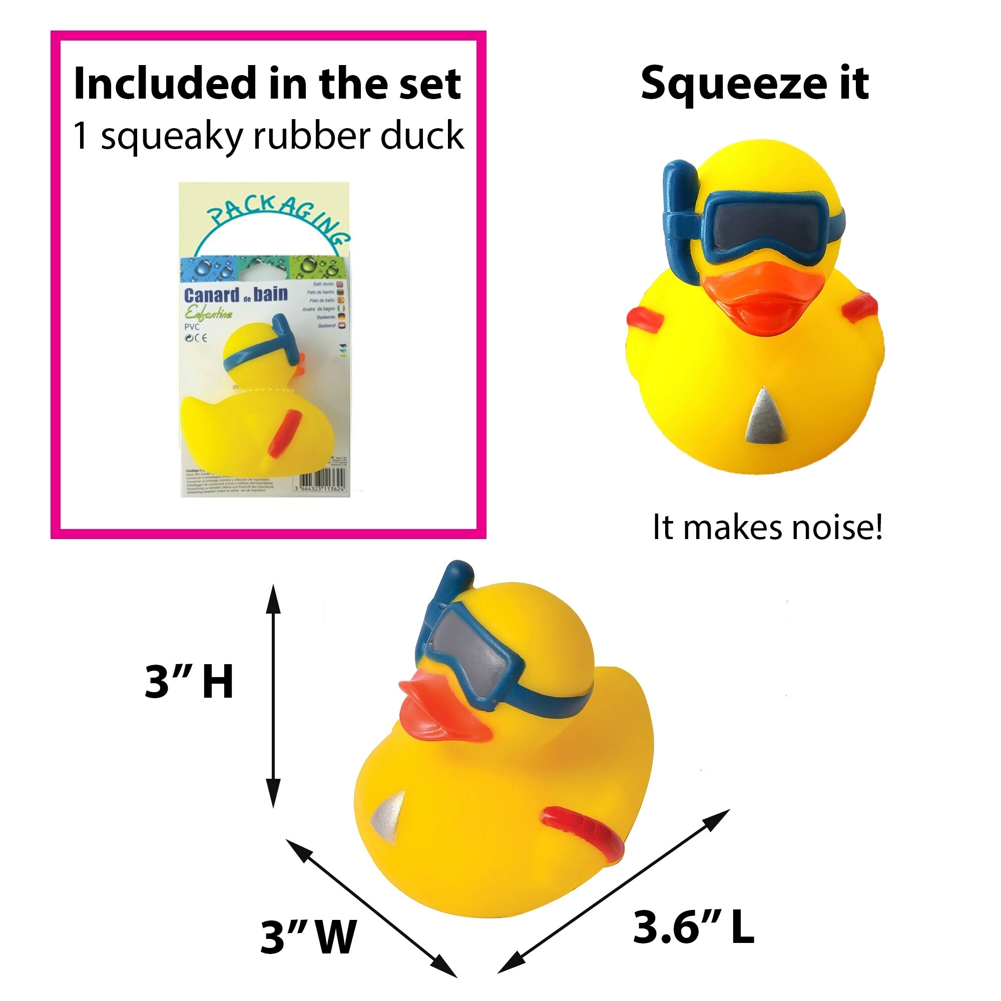 - SQUEAKY RUBBER DUCK: Simple to use, this funny yellow ducky with diving mask floats on water and makes sound when you squeeze it. Dimensions 3.6″ L x 3″ W x 3″ H