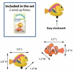 - WIND-UP FISHES: These 2 colorful fishes are easy to use. Turn the clockwork and let them go in the water! Dimensions clownfish: 3.2″ L x 1.2″ W x 2.4″ H. Dimensions yellow and pink fish: 3.6″ L x 1.4″ W x 2.8″ H