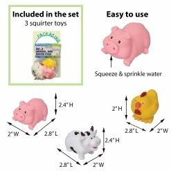 - SQUIRTER TOYS: This floating set of 3 farm animals is perfect for bathing time. Easy to squeeze, they will sprinkle water for the greatest pleasure of the kids. Includes 1 pink pig (2.8″ L x 2″ W x 2.4″ H), 1 black and white cow (2.8″ L x 2″ W x 2.4″ H) and 1 yellow and red hen (2.8″ L x 2″ W x 2″ H)