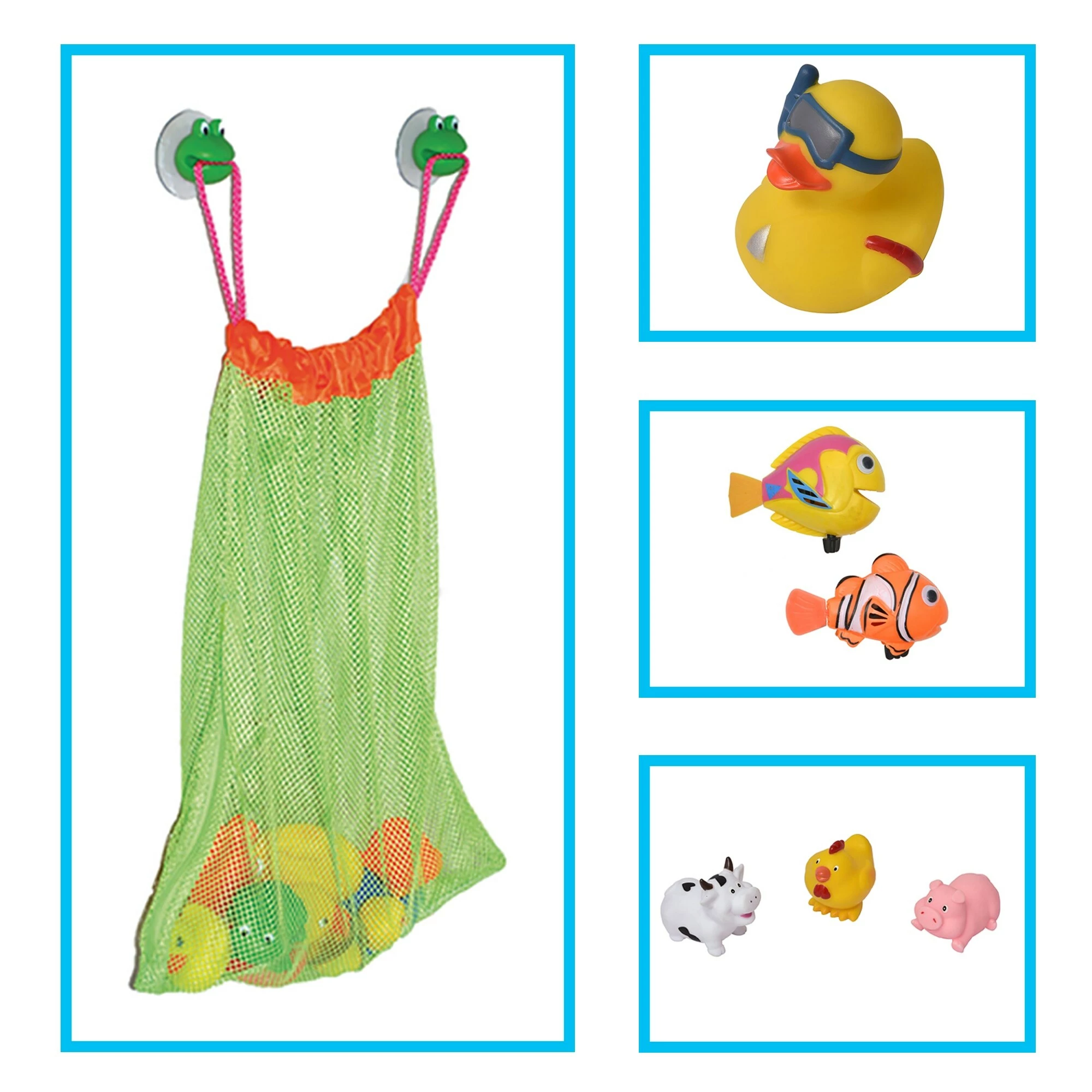 - TOY ORGANIZER: Playful green mesh bag with zipped opening and 2 frog head suction cups for easy attachment. With dimensions of 15″ L x 13.8″ W, this toy bag is big enough to hold all of your child’s toys and keep your bathroom clean!