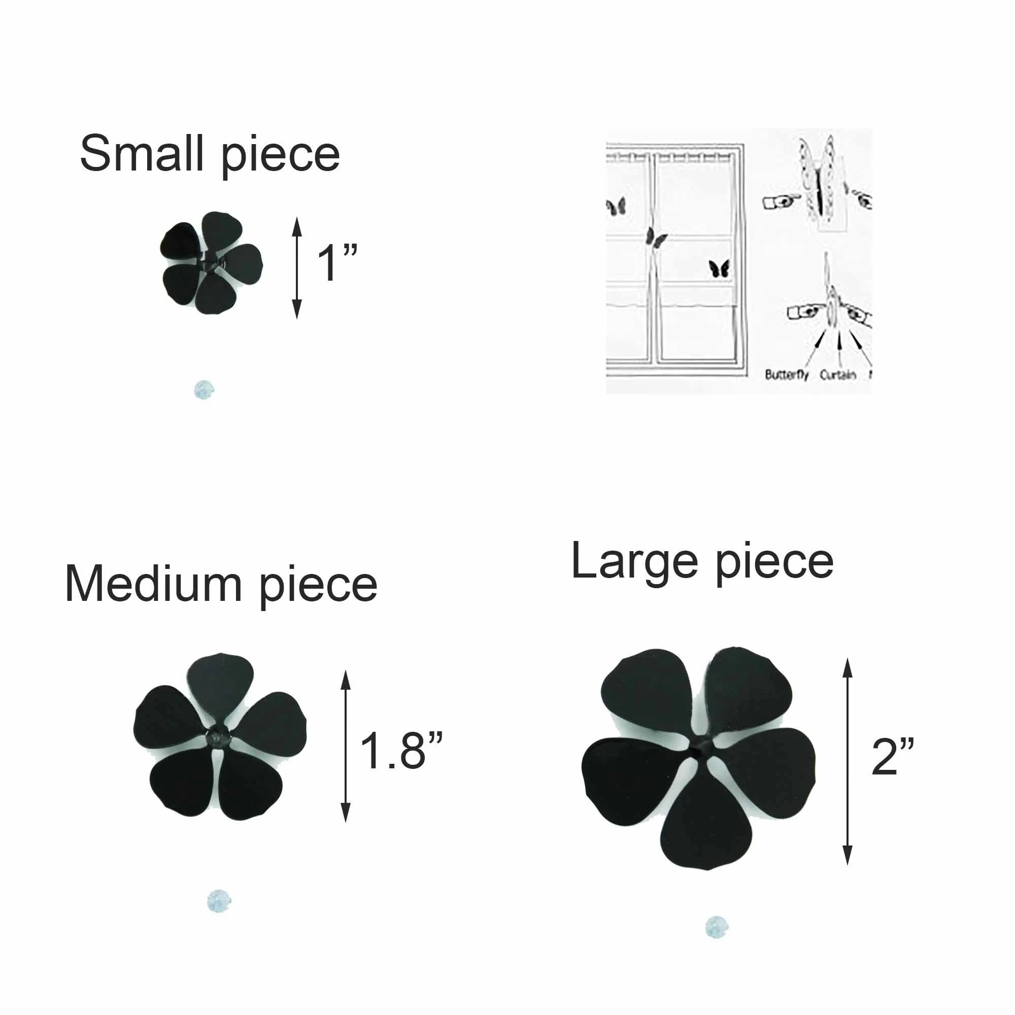 - EASY TO USE: Easy to install with its magnet, you can decorate any curtain, blackout, sheer without any damage! Dimensions for large piece: 2″L x 2″W x 0.8″D. Dimensions for medium piece: 1.8″L x 1.8″W x 0.5″D. Dimensions for small piece: 1″L x 1″W x 0.2″D