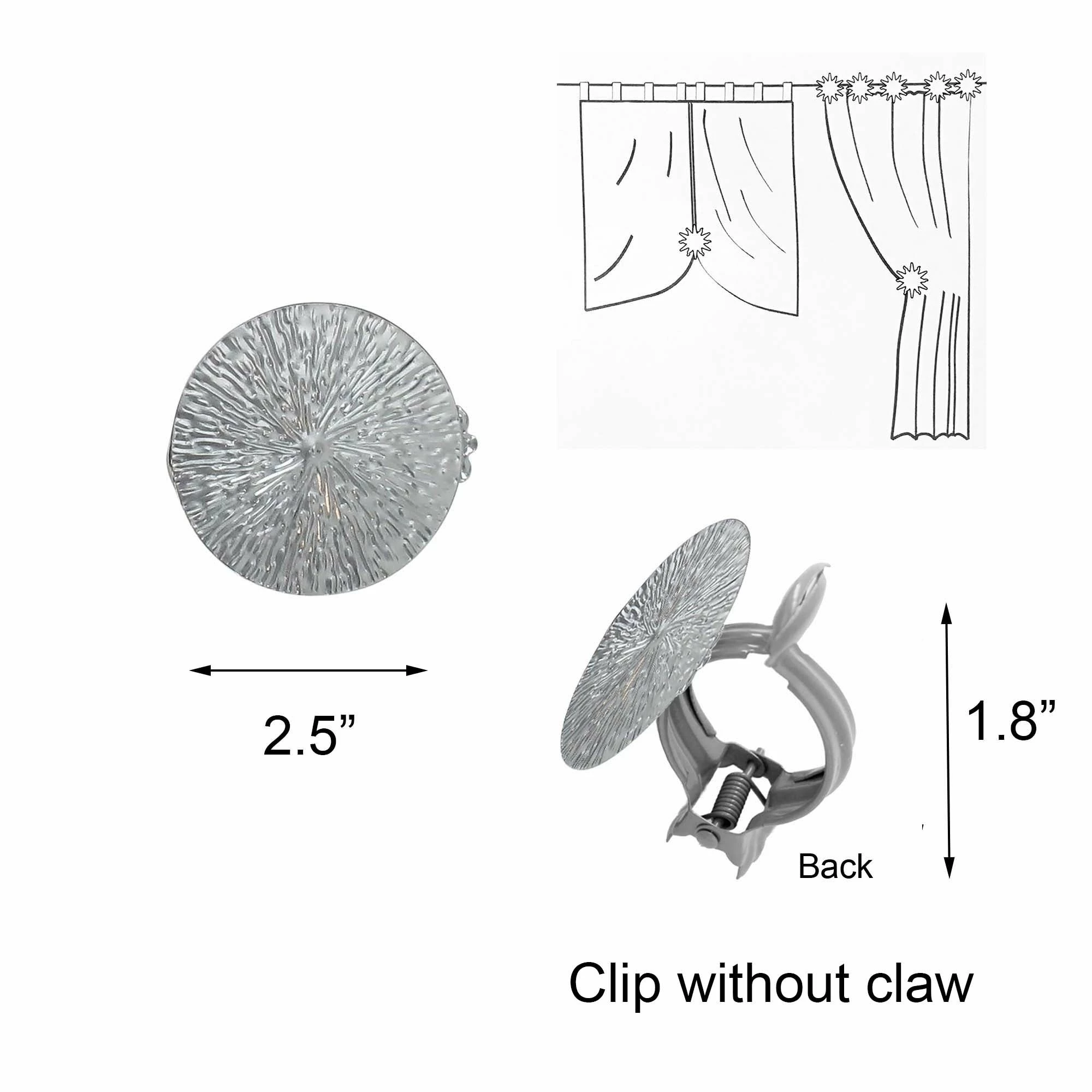 - EASY TO USE: Our stylish curtain tiebacks is a new way to hold back your drapery without tools, screws or hooks. Suitable for every mode curtain. The spring opening can hold your curtain or drape tightly without having to be connected to a wall. Just clip it on the curtain or drape. With beautiful design, these drape tie backs add a touch of elegance to almost any existing deco. Dimensions: 2.5″L x 2.5″W x 1.8″D