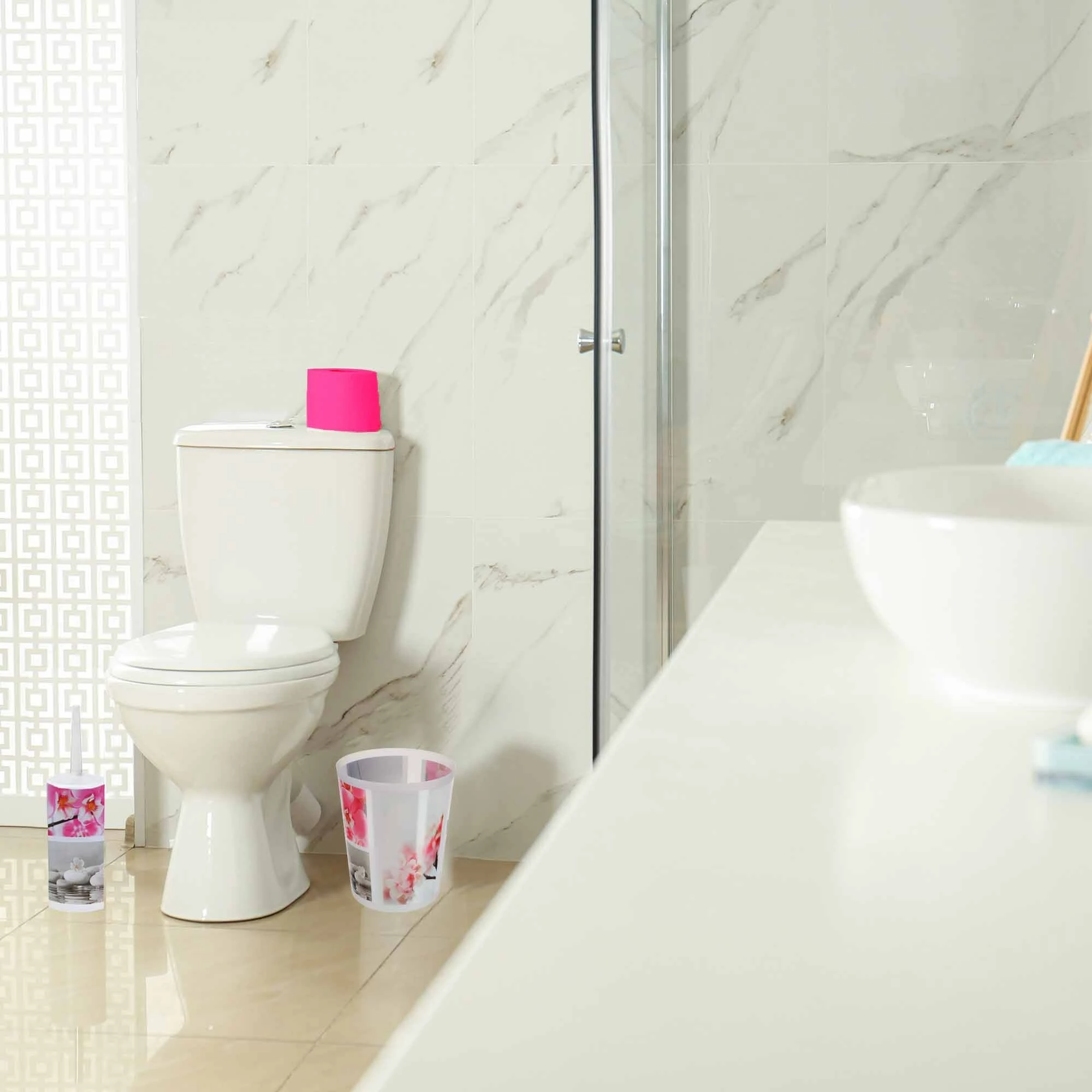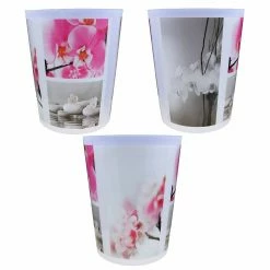 - DESIGNER ARTWORK: With its nice orchid and flower design, printed around the cylindrical silhouette of this waste basket, you will bring an floral touch to your room in seconds. This trash can is the perfect complement to any home