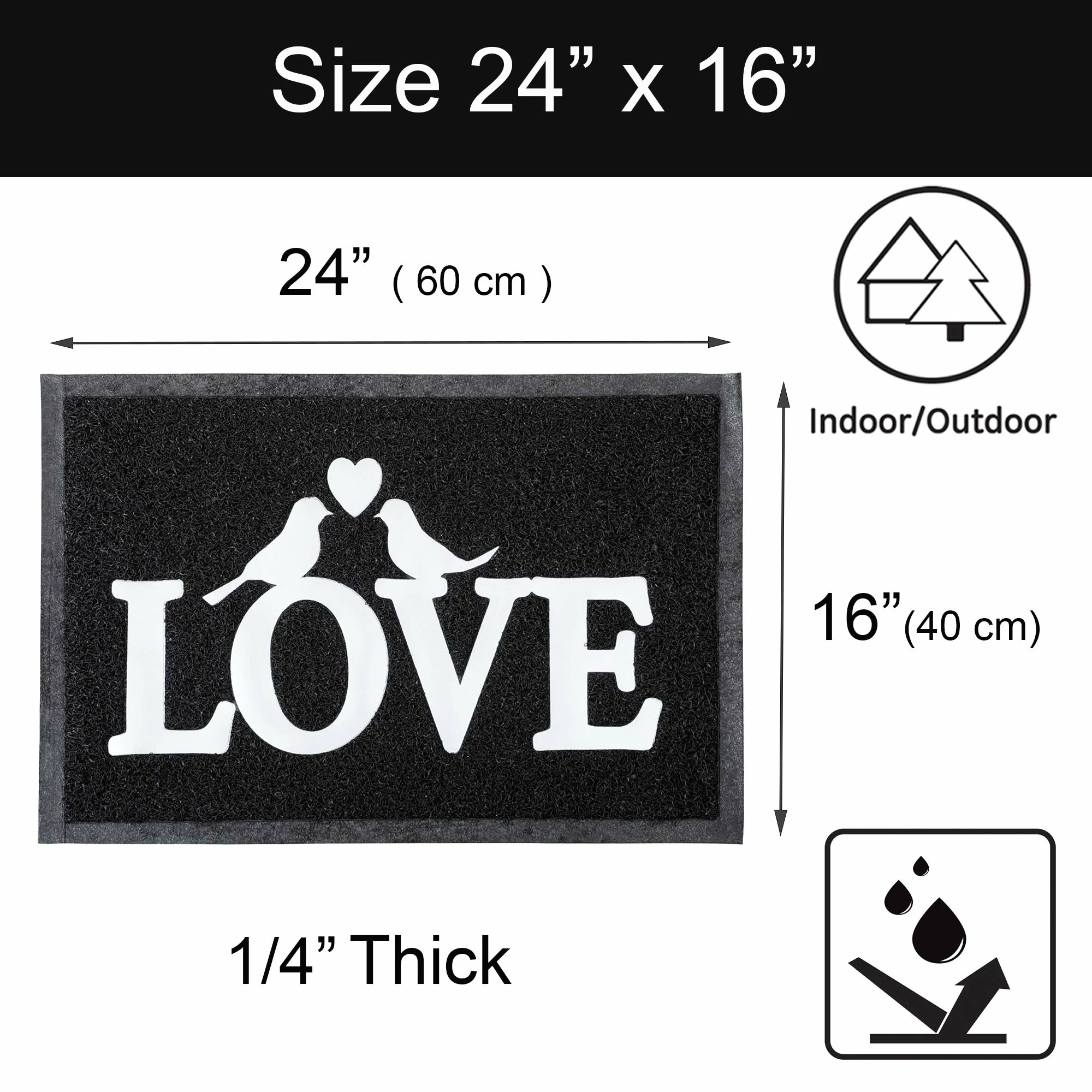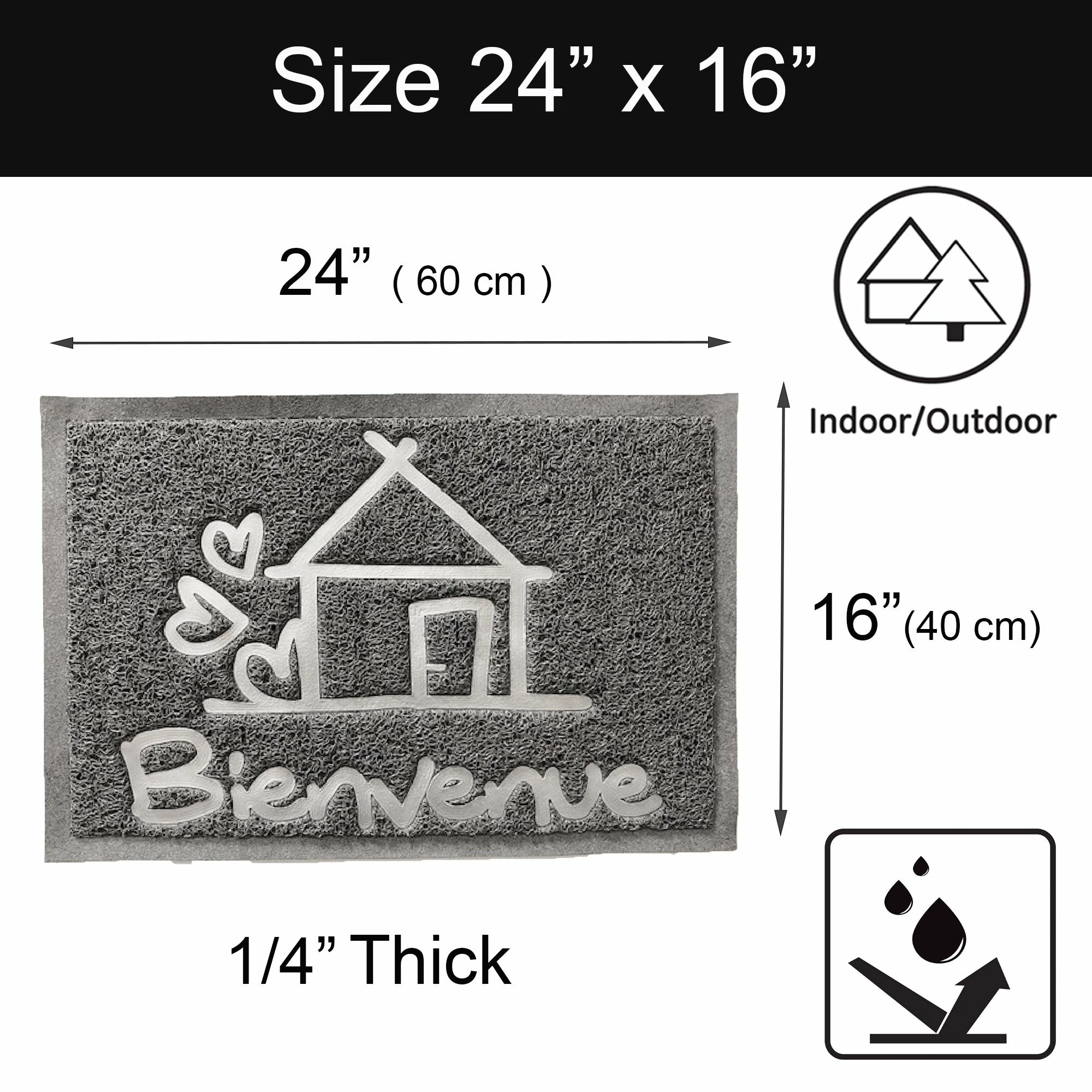 - ATTRACTIVE DESIGN: With its unique grey or black textured printed french design -Bienvenue- or Love or Home that is fade and weather resistant, this doormat will add a welcoming touch to any home entrance way. Made with heavy duty PVC, this dirt mat is tough enough to stand up to a variety of harsh conditions. Widely used for all weather, front door, exterior patio, entry way, porch door, garage, garden, commercial deal with high traffic inside and outside