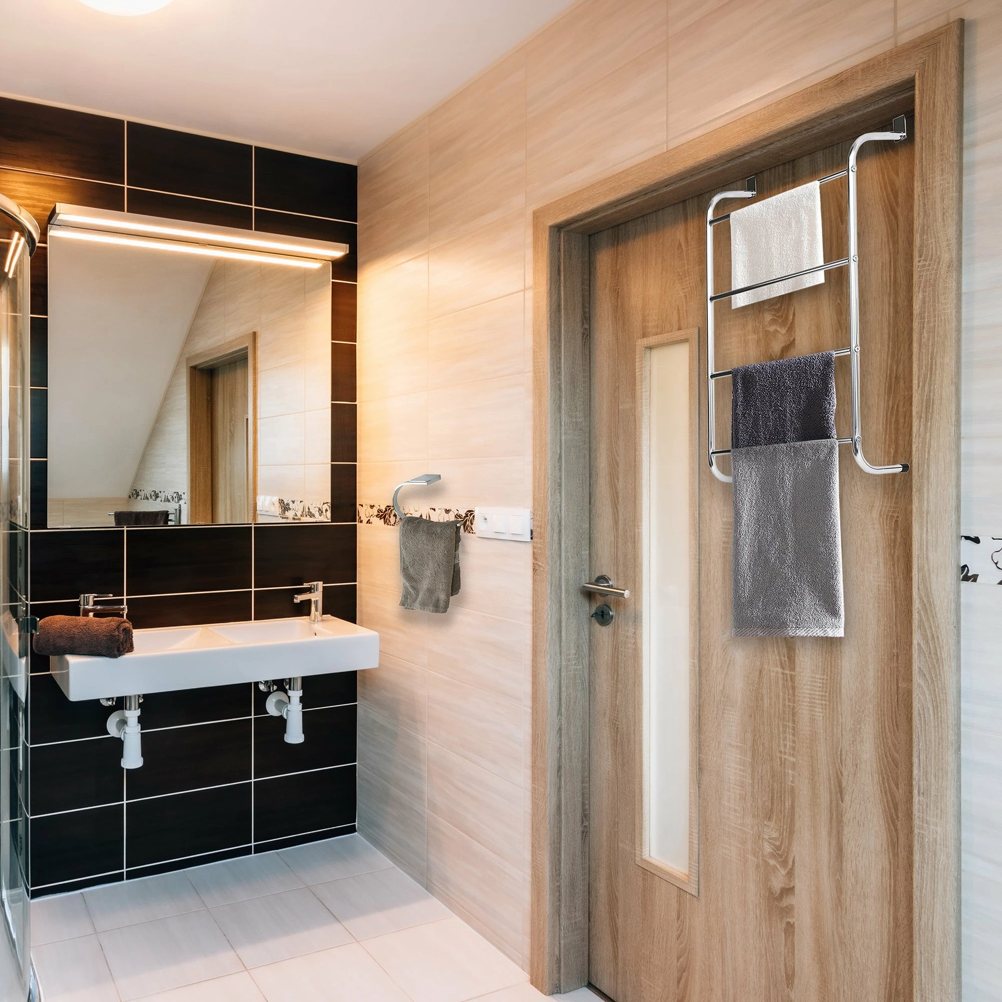 - NICE DESIGN : This slick modern towel organizer adds a splash of unique style and functional convenience to your home. The flared design of the side bars offers great airflow for faster drying, no more damp towels in your bathroom or laundry. Distance from the door : 4.6 Inches