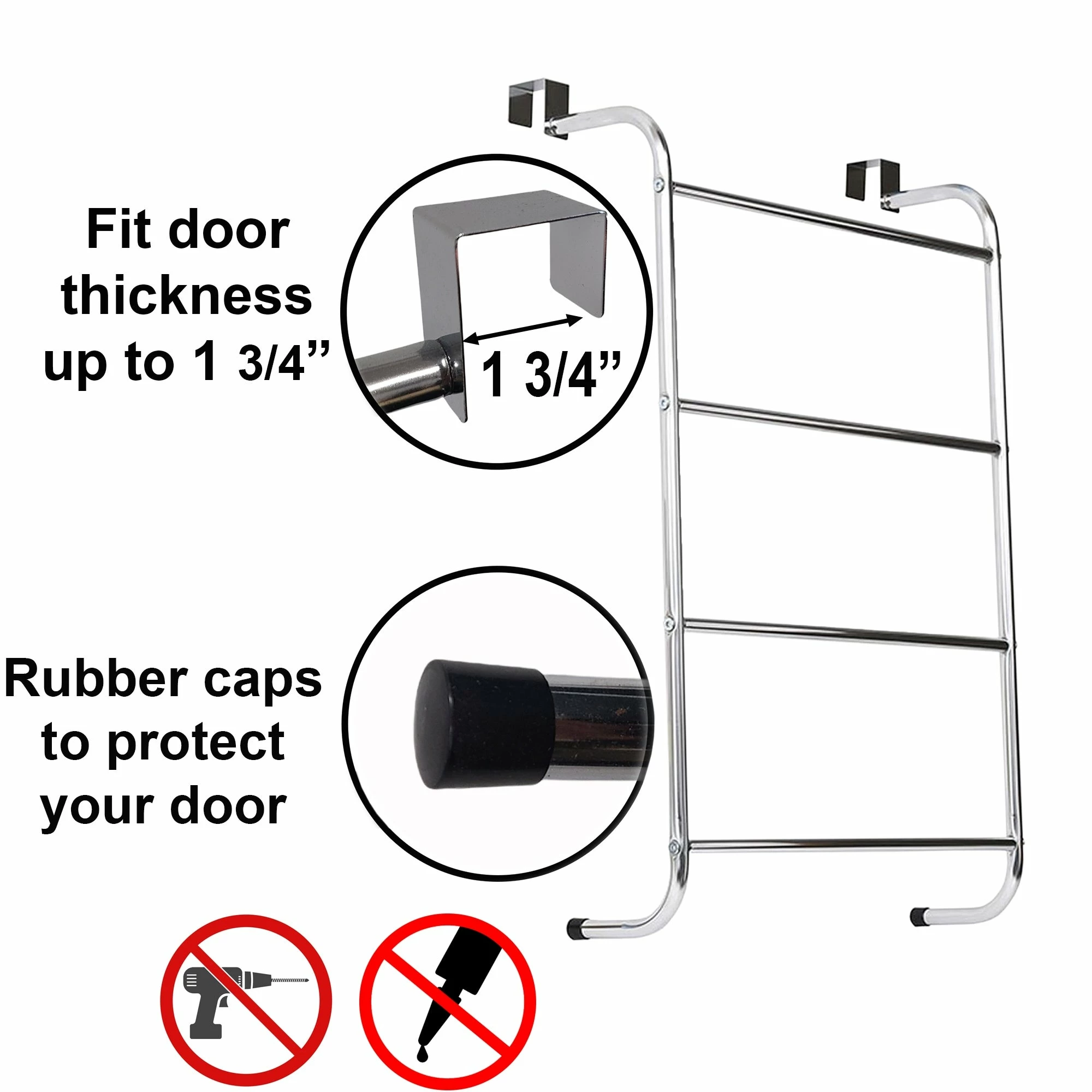 - OVER-THE DOOR TOWEL HOLDER : Fits easily over the top of any standard door up to 1-3/4 thick. Please check the door width before ordering. Store your towels, bathrobes, clothes and others accessories by taking advantage of unused space. Color chrome