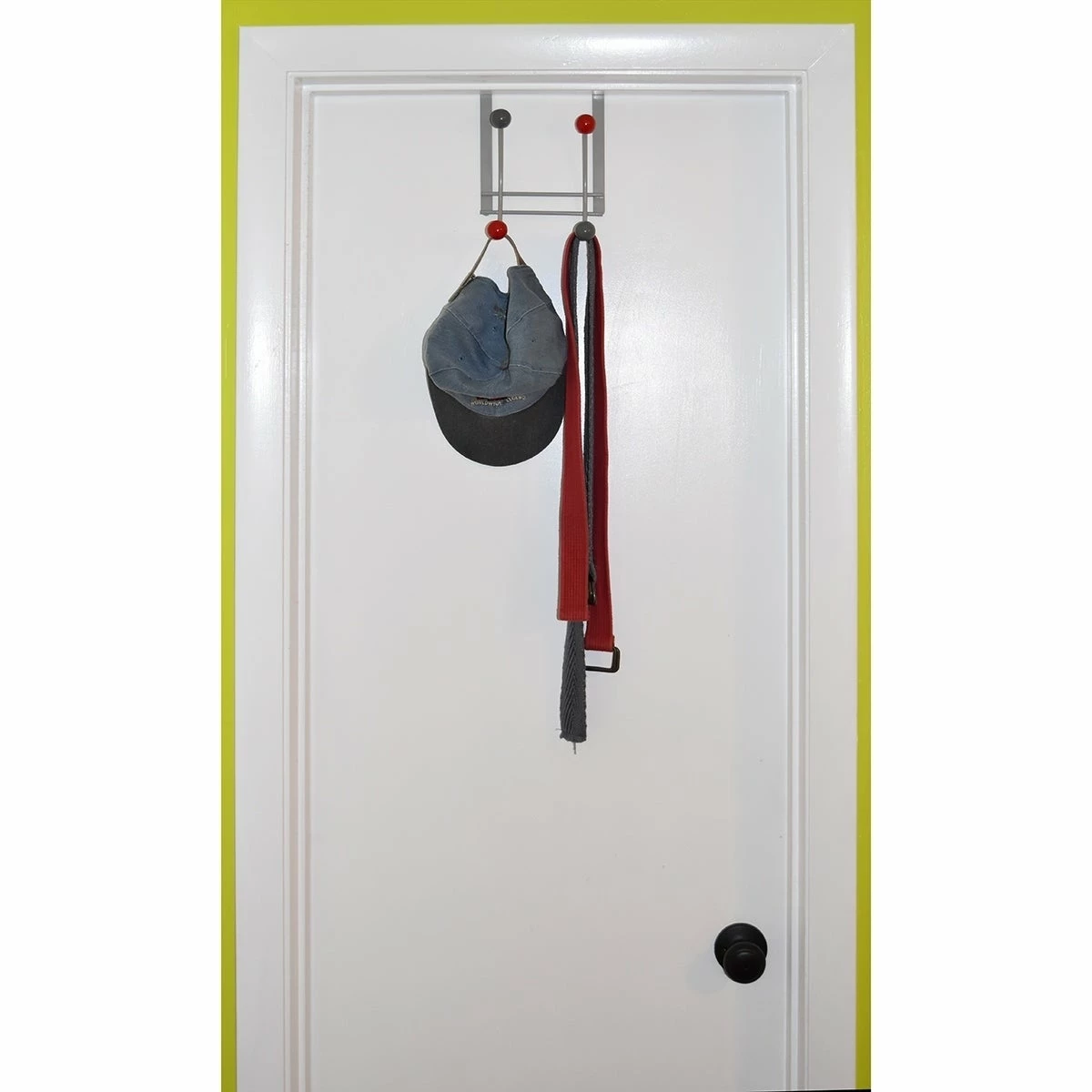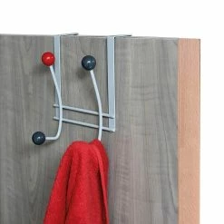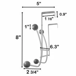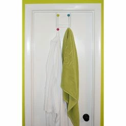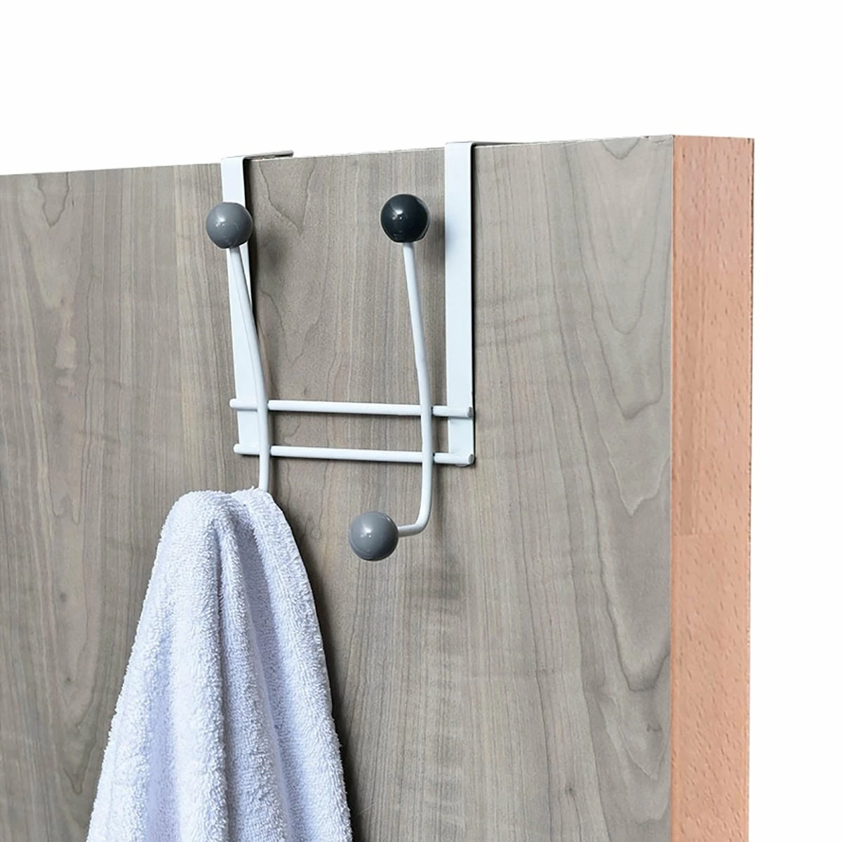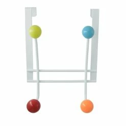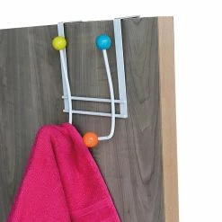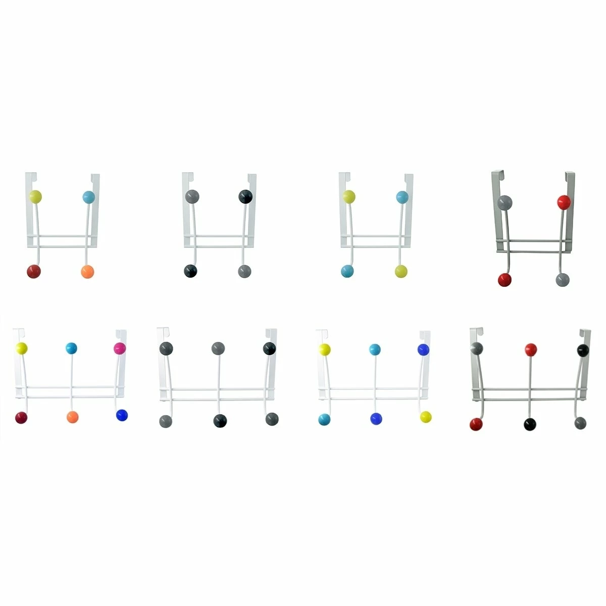 Add storage easily to any bathroom, closet or room in your home without the need for tools or hardware. This over the door rack organizer is made of white coated metal with 4 resin hanging balls (diameter 1 Inch) and is built to hold up to 100 lbs . Store your towels, bathrobes, clothes and others accessories by taking advantage of unused space on the back of any door. Color white (rack) and multicolor (hanging balls). The sturdy brackets of this hanging hook caddy fit over the top of any interior standard door up to 1-7/8 (1.14) thick Inch, check the thickness of your door before purchasing, not suitable for glass, closet or cabinet doors. for smoothly opening and closing the door with these hooks, be sure there is a gap of a coin thickness (1.5 mm) over the door. Wipe clean. Width 6.3 or 10.5 -Inch, depth 5-Inch and height 8-Inch. This space saving door hanger will help you to create convenient hanging spaces and will give your bathroom a modern style. Imported from france, made in PRC. Available in 3 different colors and also with six hooks.