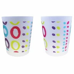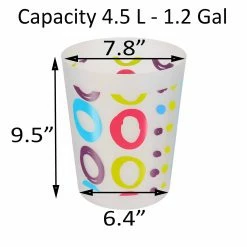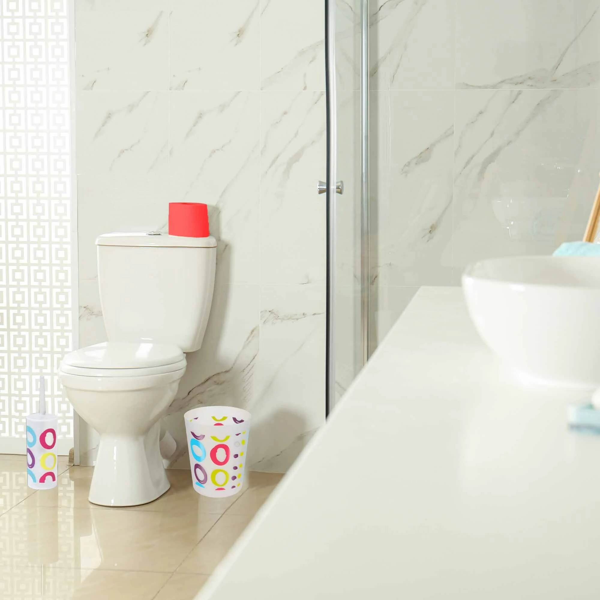 - DESIGNER ARTWORK: With its polka dots and colorful circles design, printed around the cylindrical silhouette of this waste basket, you will bring a modern touch to your room in seconds. This trash can is the perfect complement to any home