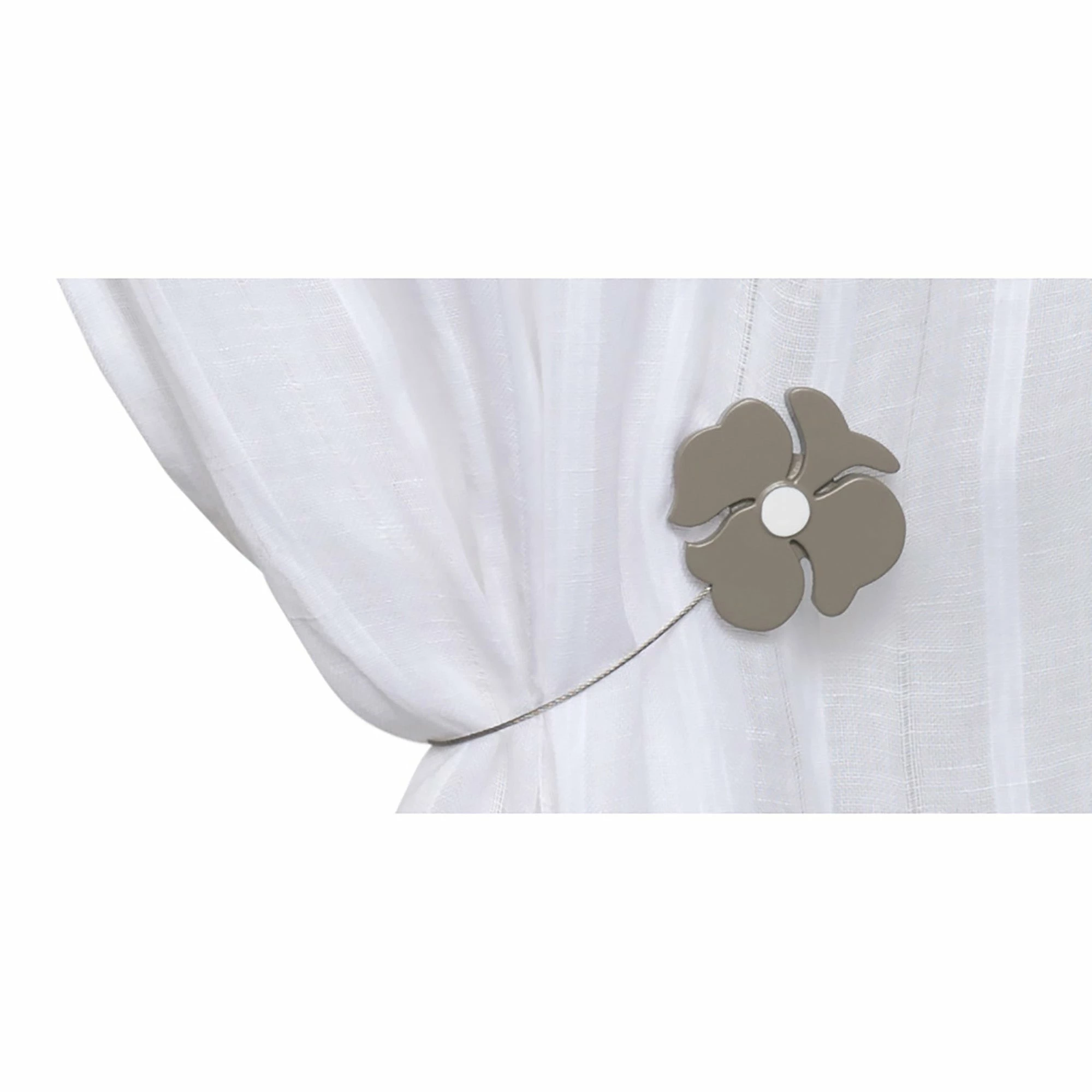 - MAGNETIC TIEBACKS : Magnaclip are creatively designed with magnetic ends at the head of the tieback that hold perfectly drapes or sheers. The strong and durable magnet will stay in place and will hold the drapes tightly. Not recommanded with heavy curtain panels. Comes with 1 magnetic snap. 4 colors available: taupe with white pistil, black silver with white pistil, mat gold, chrome