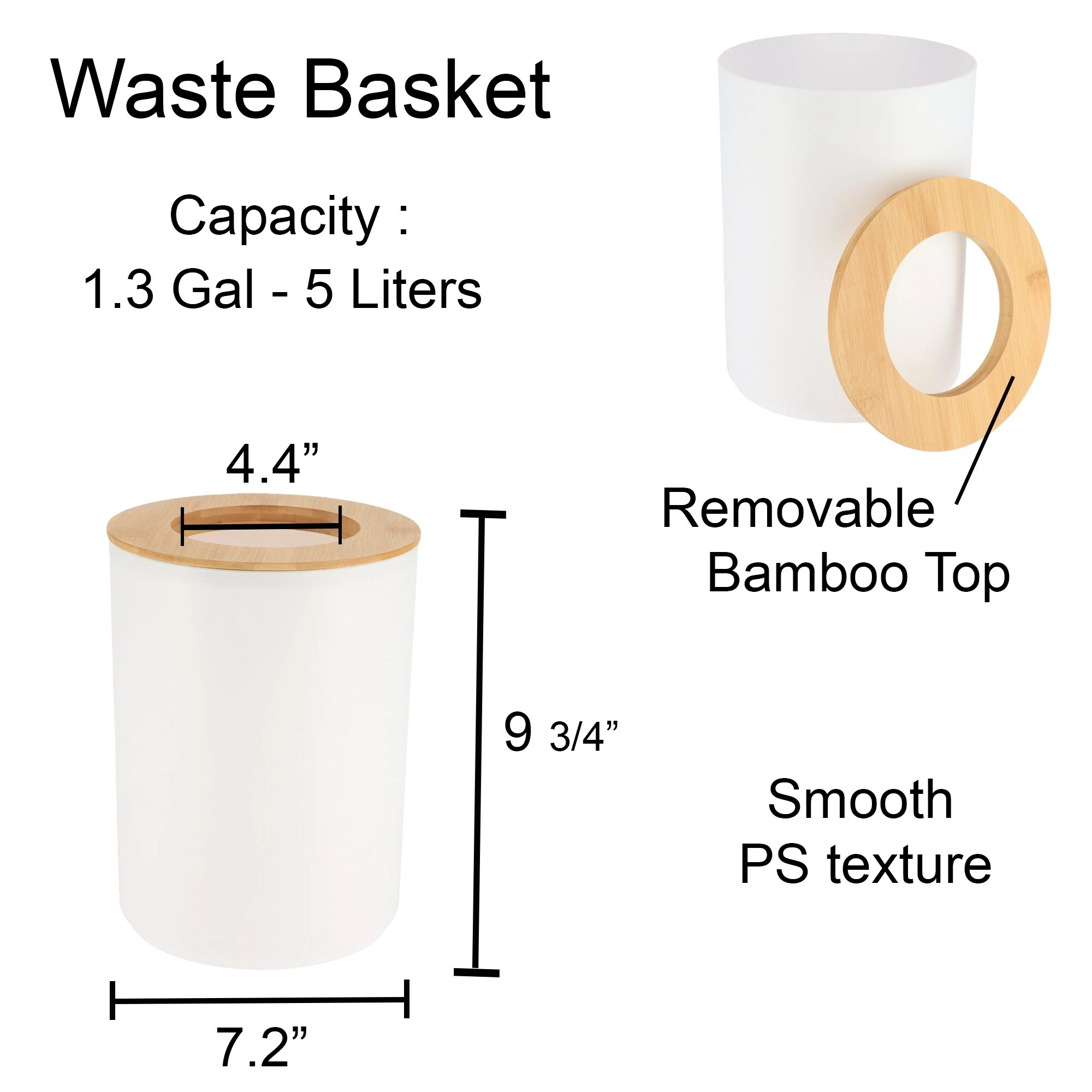 - NICE STORAGE CAPACITY : With its 5 liters or 1.3-Gal capacity, this trash can is ideal for bathroom, kitchen or office use. With a diameter of 7.2″ and a height of 9 3/4″, this wastebasket fits easily in rooms with limited places