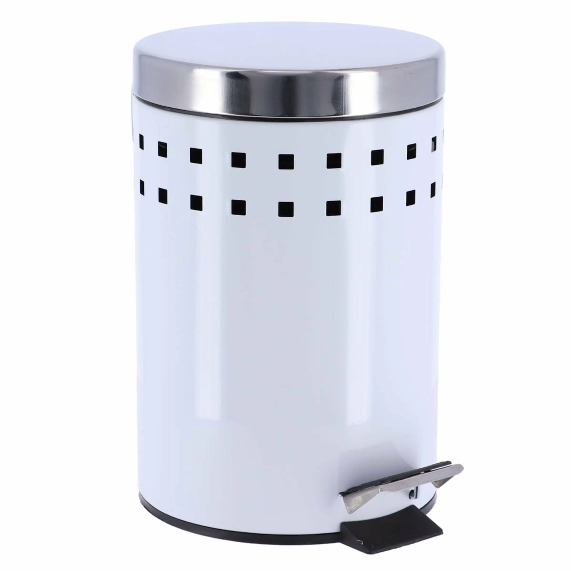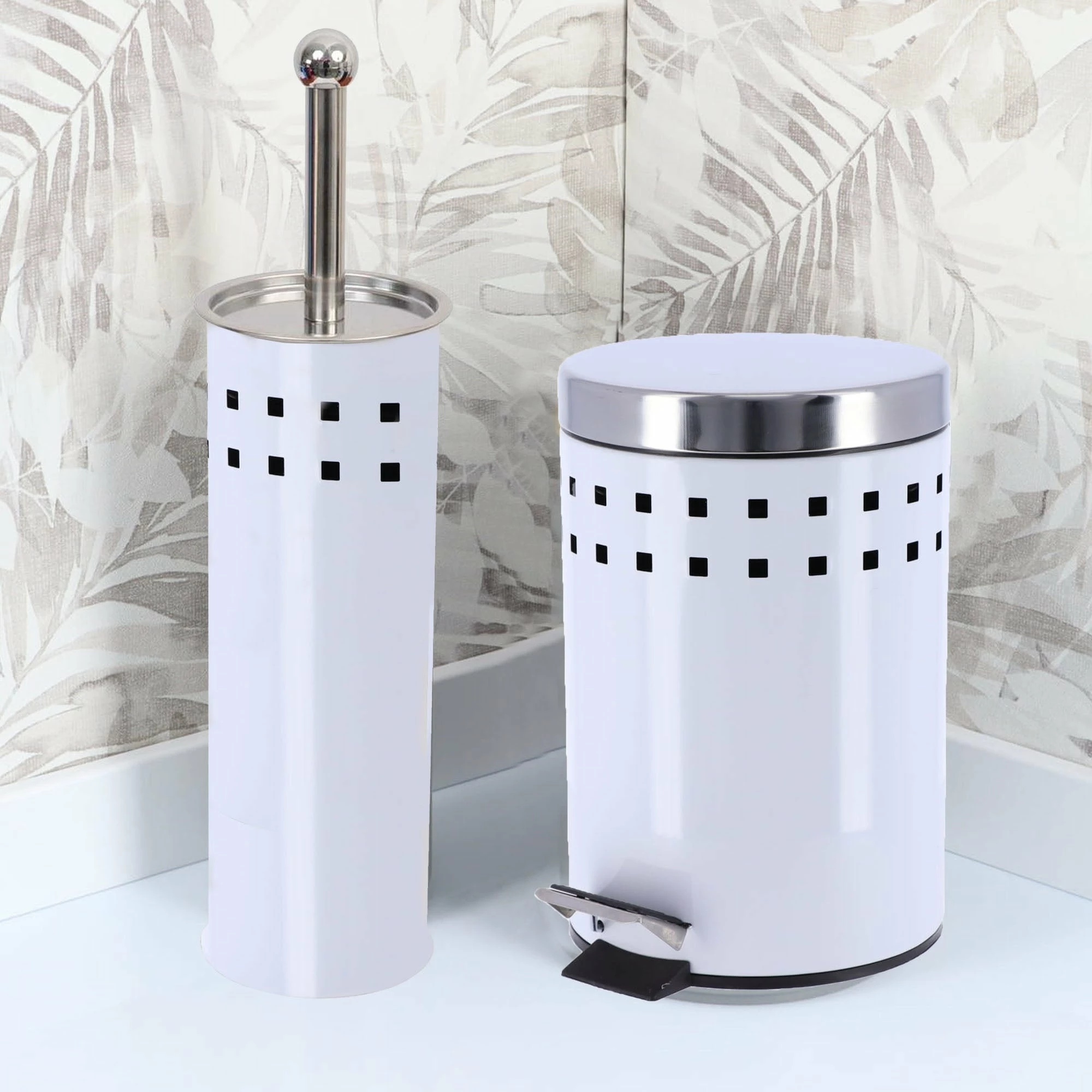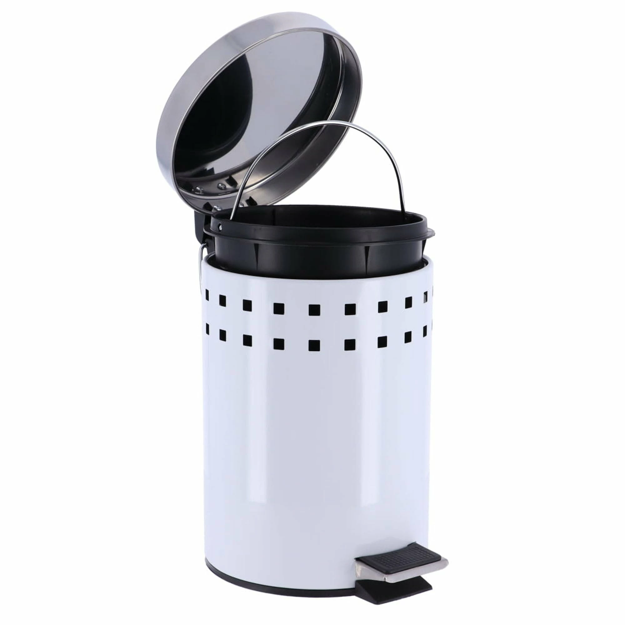 - DESIGN & STURDY: With its 2 perforated lines and stainless steel lid, this white waste basket brings a modern touch to your room in seconds. Sturdy, with its rounded top lid, it will be the perfect trash can for your bathroom. The bin is easy to move since it has a handle on the back.