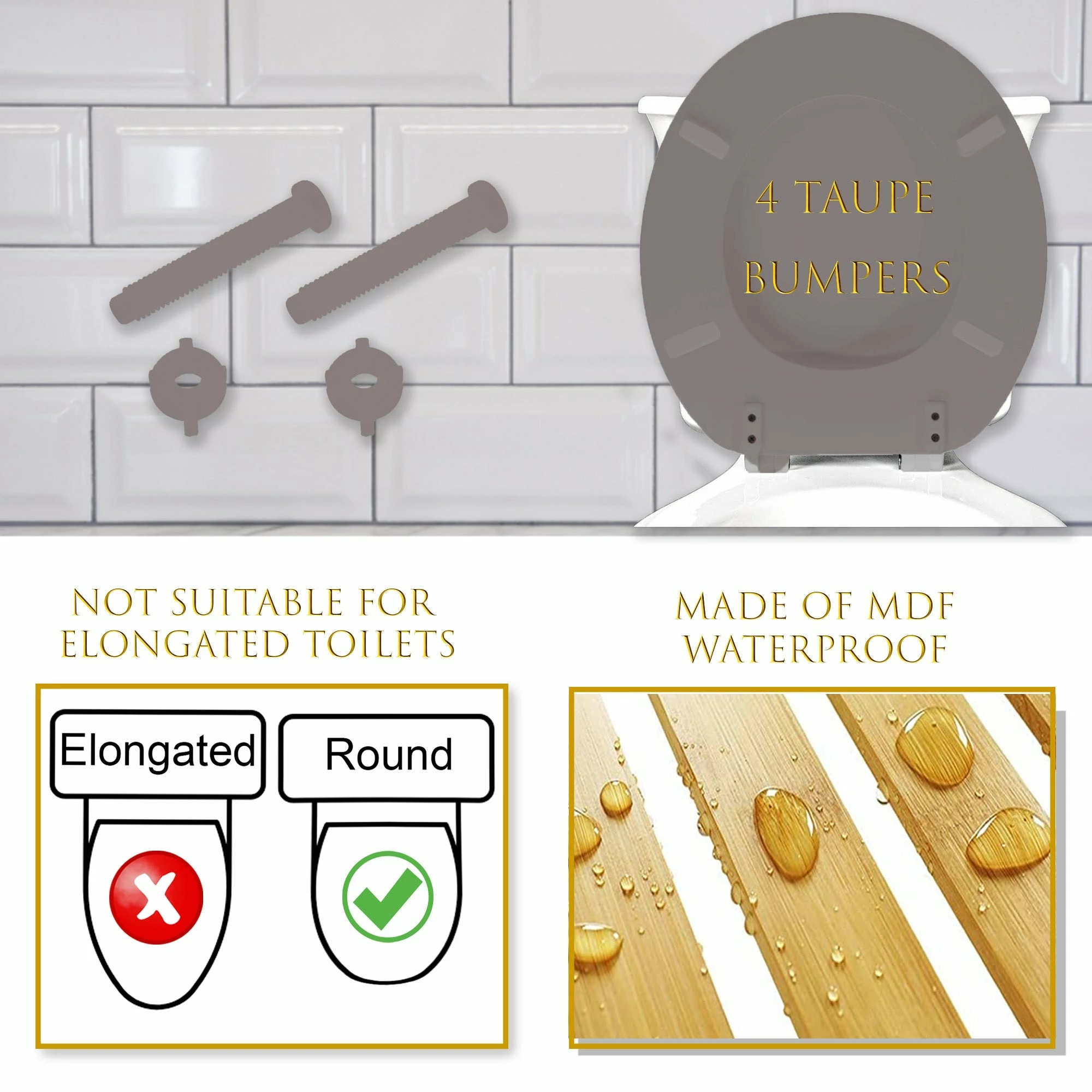 - QUALITY : Made of molded wood with a beveled edge. A multi-coat enamel offers durability and a nice glossy finish. 4 bottom grip-tight bumpers will protect your toilet seat from damage