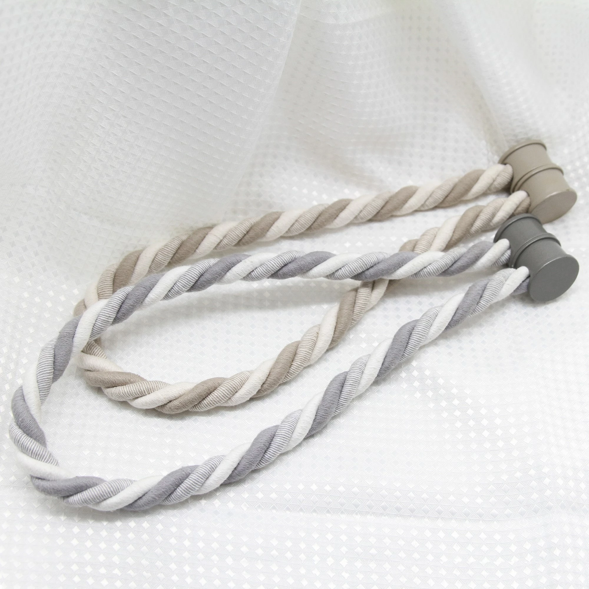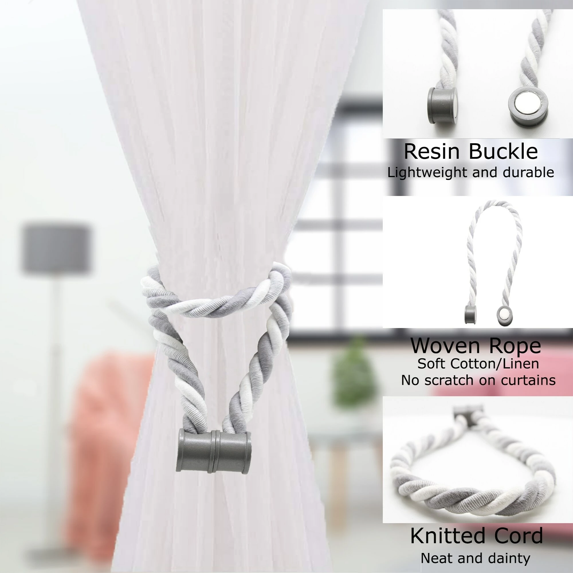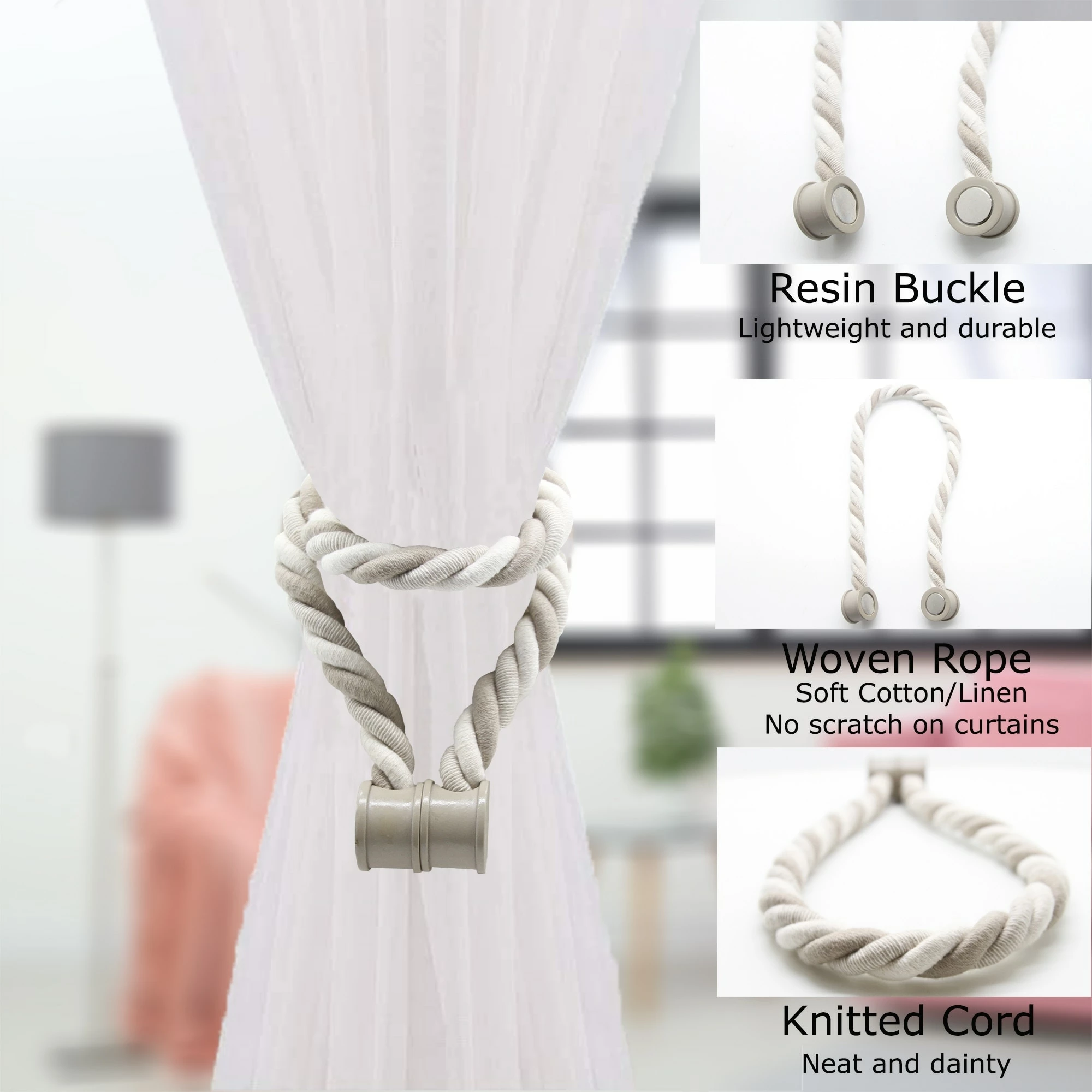 - MAGNETIC TIEBACKS : Magnaclips are creatively designed with magnetic ends at the head of the tieback that hold perfectly drapes or sheers. The strong and durable magnets will stay in place and will hold the drapes tightly. These magnetic curtain tiebacks snap together without any effort when you want to tie the curtains back. Comes with 2 magnetic wooden buckles. 2 colors available: beige-off white with taupe knob, light grey-dark grey with grey knob