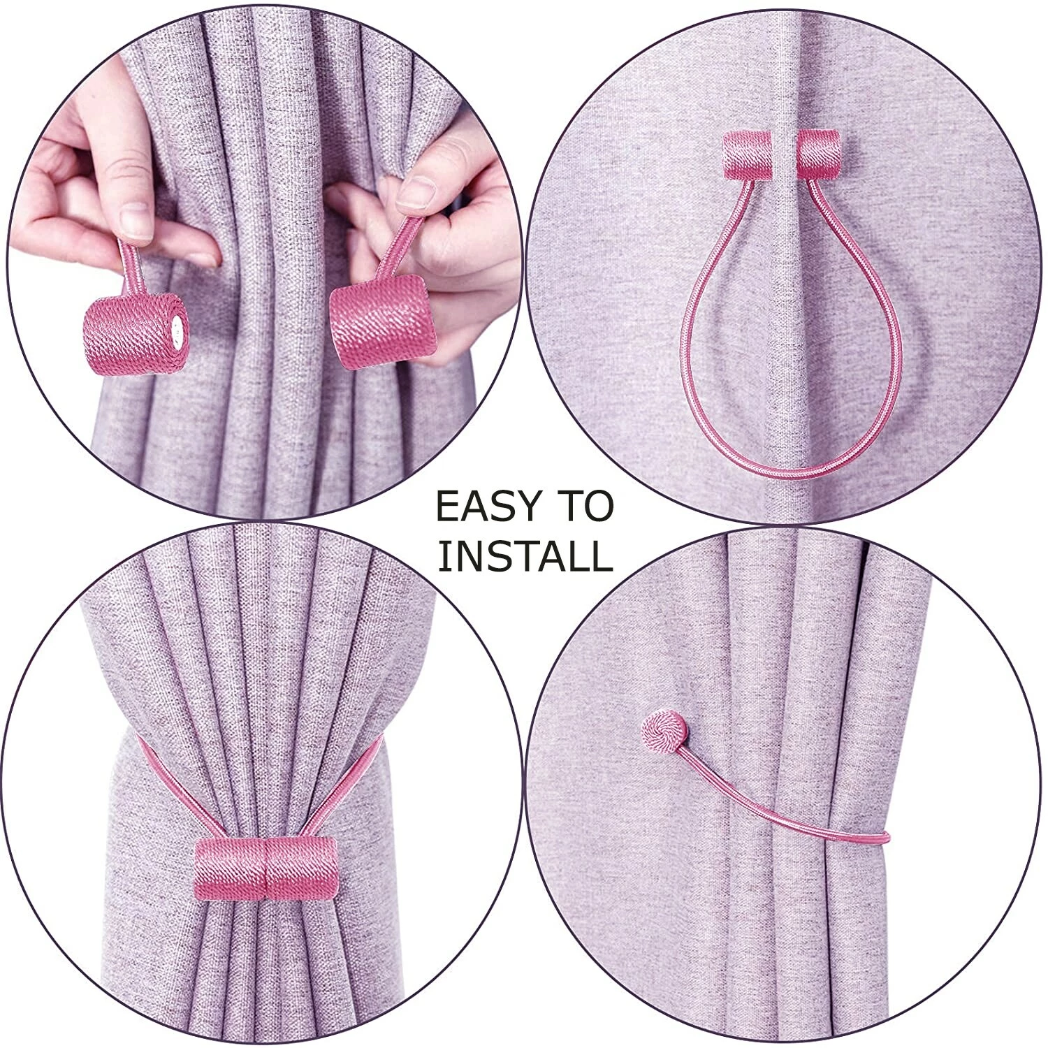 - VERSATILE USE: This tieback could be twisted, single loop, double loop, 3 ring vertical design, and others just let your imagination run wild, suit for small and thin curtains, sheer curtains, blackout curtains, wide patio door or sliding door curtains. You can position these magnetic tiebacks pretty much where you want them, higher up, closer to the side of the window or to the center, lower down. You can open and close your curtains daily to let the light in and close them at night for privacy