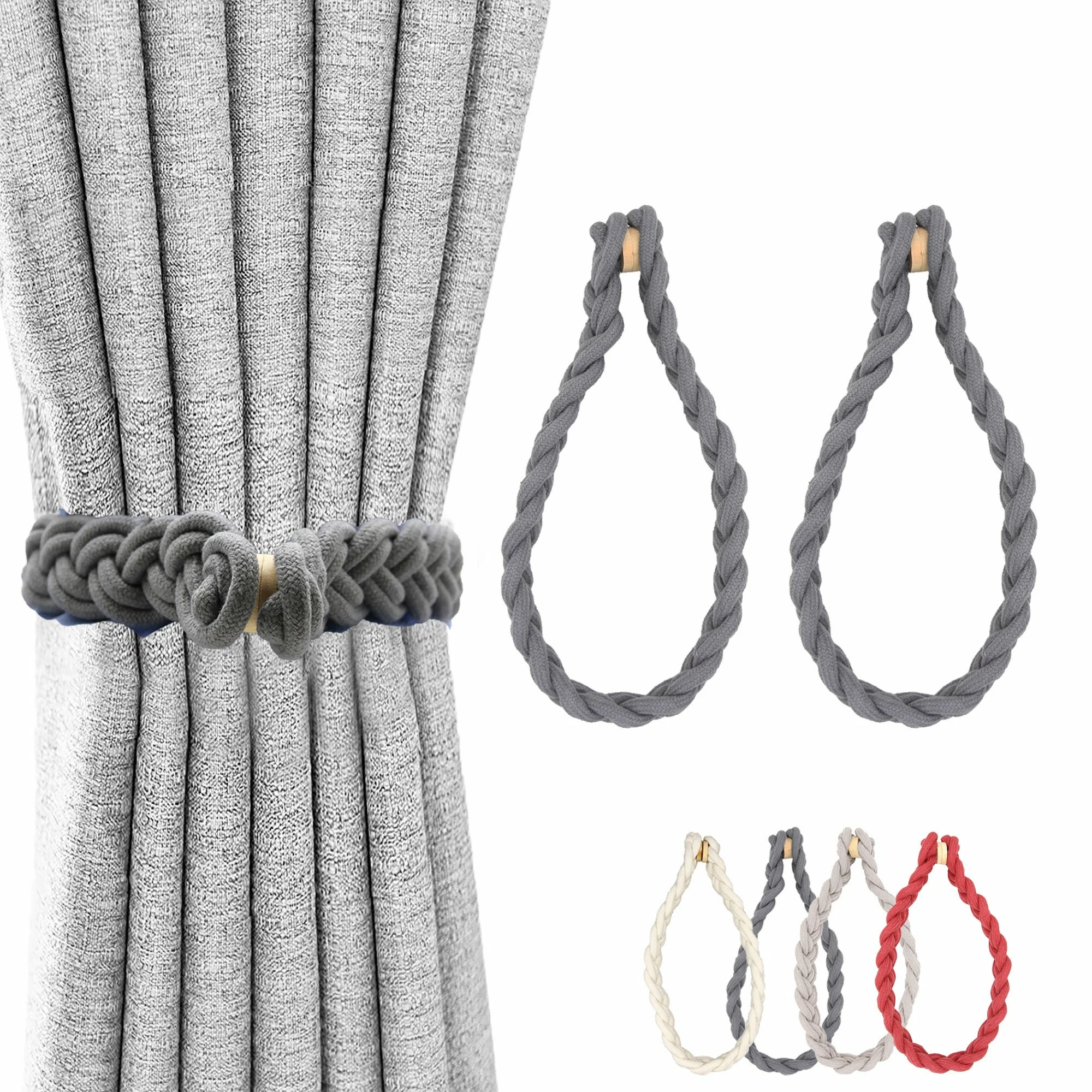 - MAGNETIC TIEBACKS : Magnaclips are creatively designed with magnetic ends at the head of the tieback that hold perfectly drapes or sheers. The strong and durable magnets will stay in place and will hold the drapes tightly. These magnetic curtain tiebacks snap together without any effort when you want to tie the curtains back. Comes with 2 magnetic wooden buckles. 4 colors available: beige, red, grey, taupe