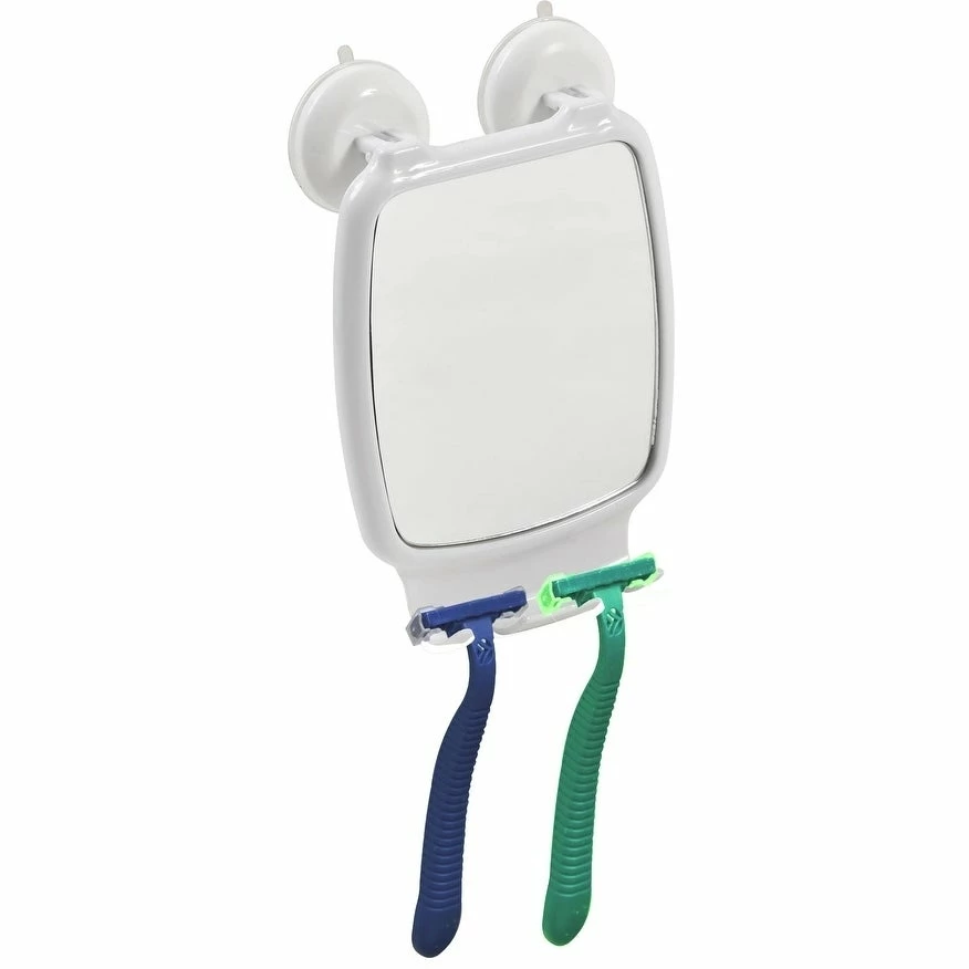 This bathroom or shower mirror has super strong suction cups to adhere to your shower wall and the dual built-in razor holders make it ideal for shaving in the shower. It provides maximum suction on smooth non-porous surfaces such as tile, glass, fiberglass and some metals. The suction hooks attach by simply pushing the cup against a surface and locking the hook into place. Suction seal is released when hook is lifted back up. It easily holds any standard razor without any drilling, tools, or damage to your walls. Length of 5.82-Inch, depth of 1.10-Inch and height of 8.10-Inch. Maximum weight is 3 pounds, do not exceed this weight. Wipe clean with soapy water. Color white. Imported from France, made in PRC. Ideal for shaving in the shower or in your tub and keep your razor where you want it, within reach!