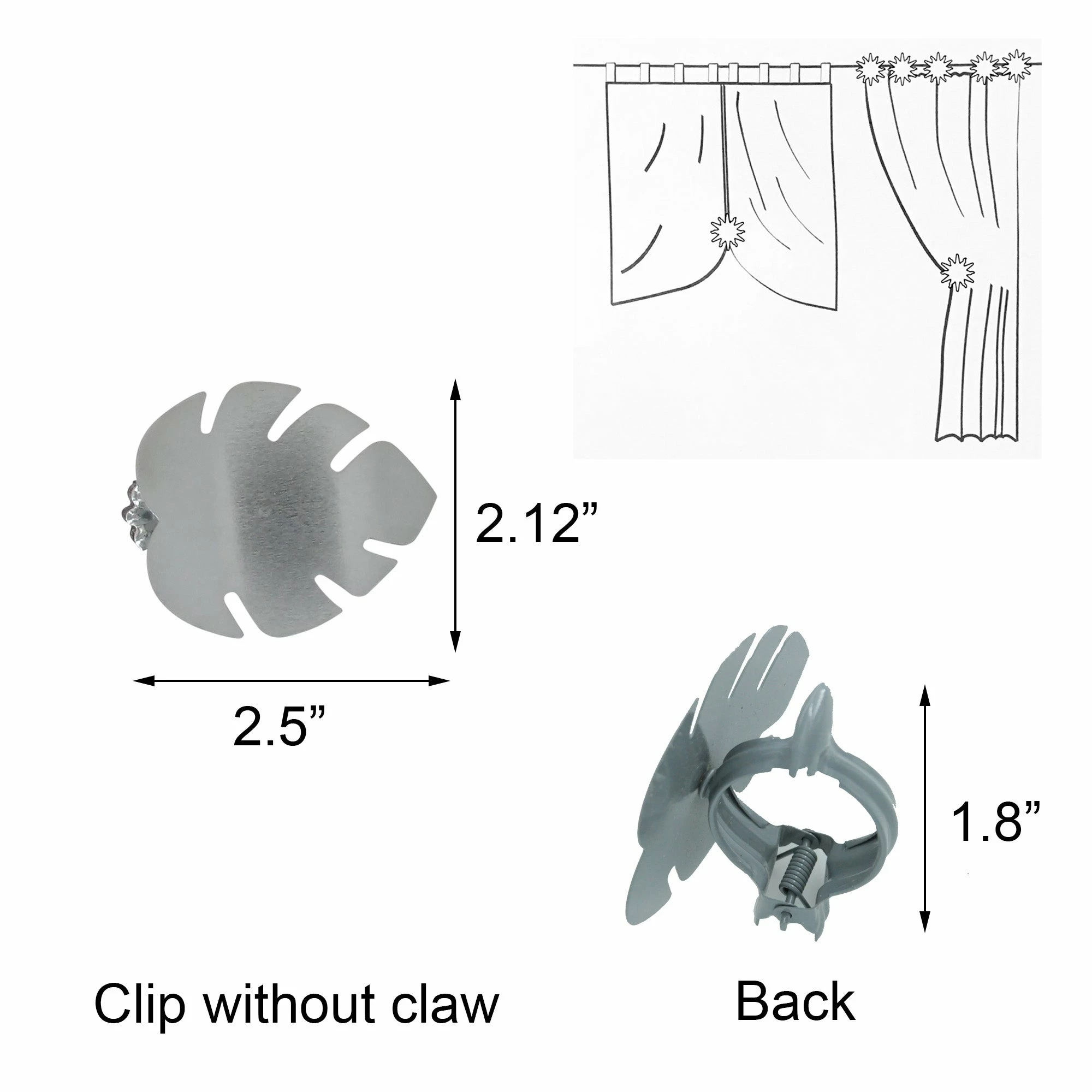 - EASY TO USE: Our stylish curtain tiebacks is a new way to hold back your drapery without tools, screws or hooks. Suitable for every mode curtain. The spring opening can hold your curtain or drape tightly without having to be connected to a wall. Just clip it on the curtain or drape. With beautiful design, these drape tie backs add a touch of elegance to almost any existing deco. Dimensions: 2.5″L x 2.12″W x 1.8″D