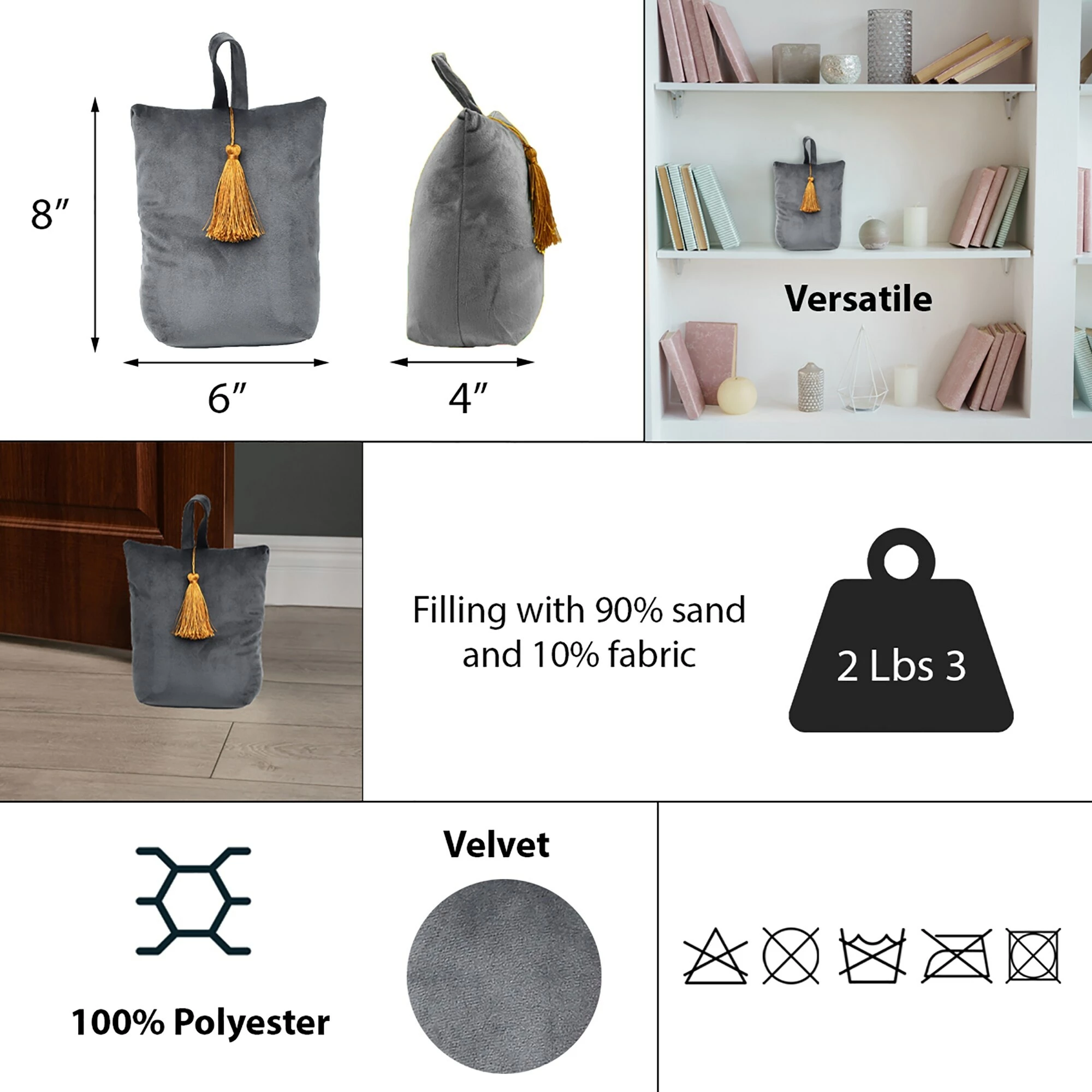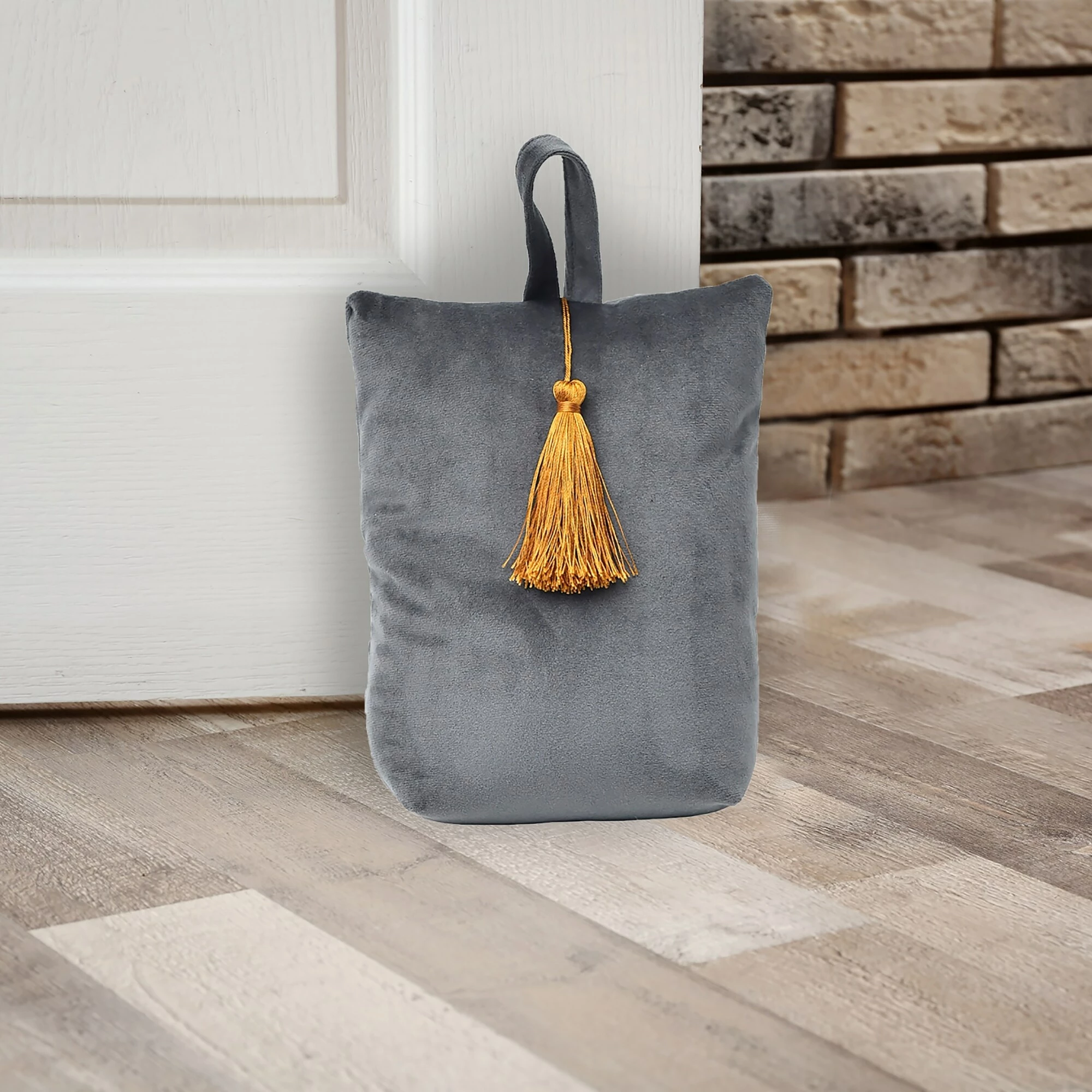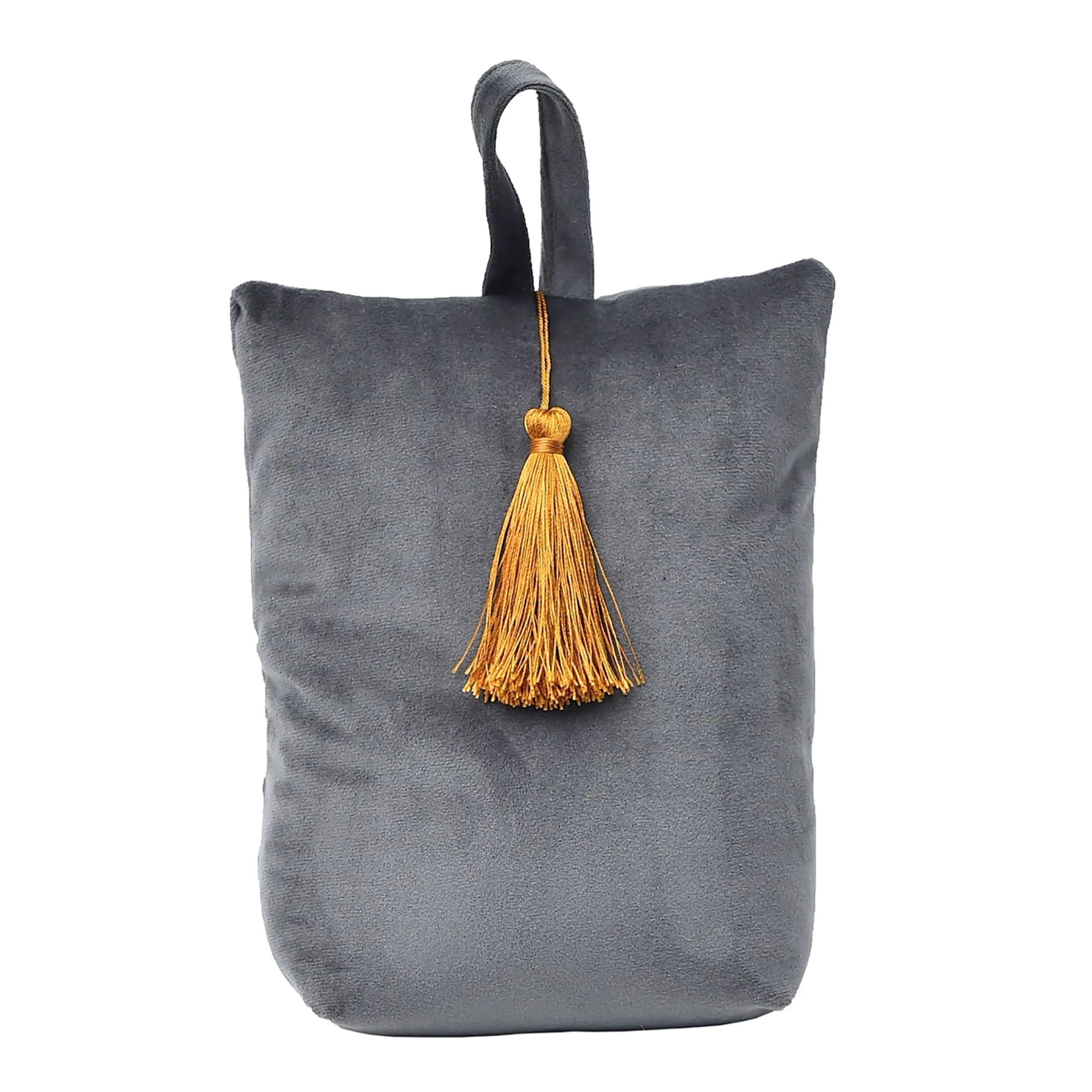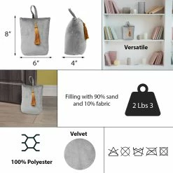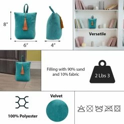 - COMPACT BAG : Made of polyester, filled with sand with a weight of 2.2 lbs (1 kg), this doorstop bag will hold interior doors open, works great on carpet and hard flooring and very easy to move around. Not recommended for heavy front doors or exterior doors, not suitable for use as a toy for a child or dog. Dimensions of 6″L x 4.6″W x 8″H, 5 colors available : turquoise blue, light grey, dark grey, dark green, gold, all with a golden tassel