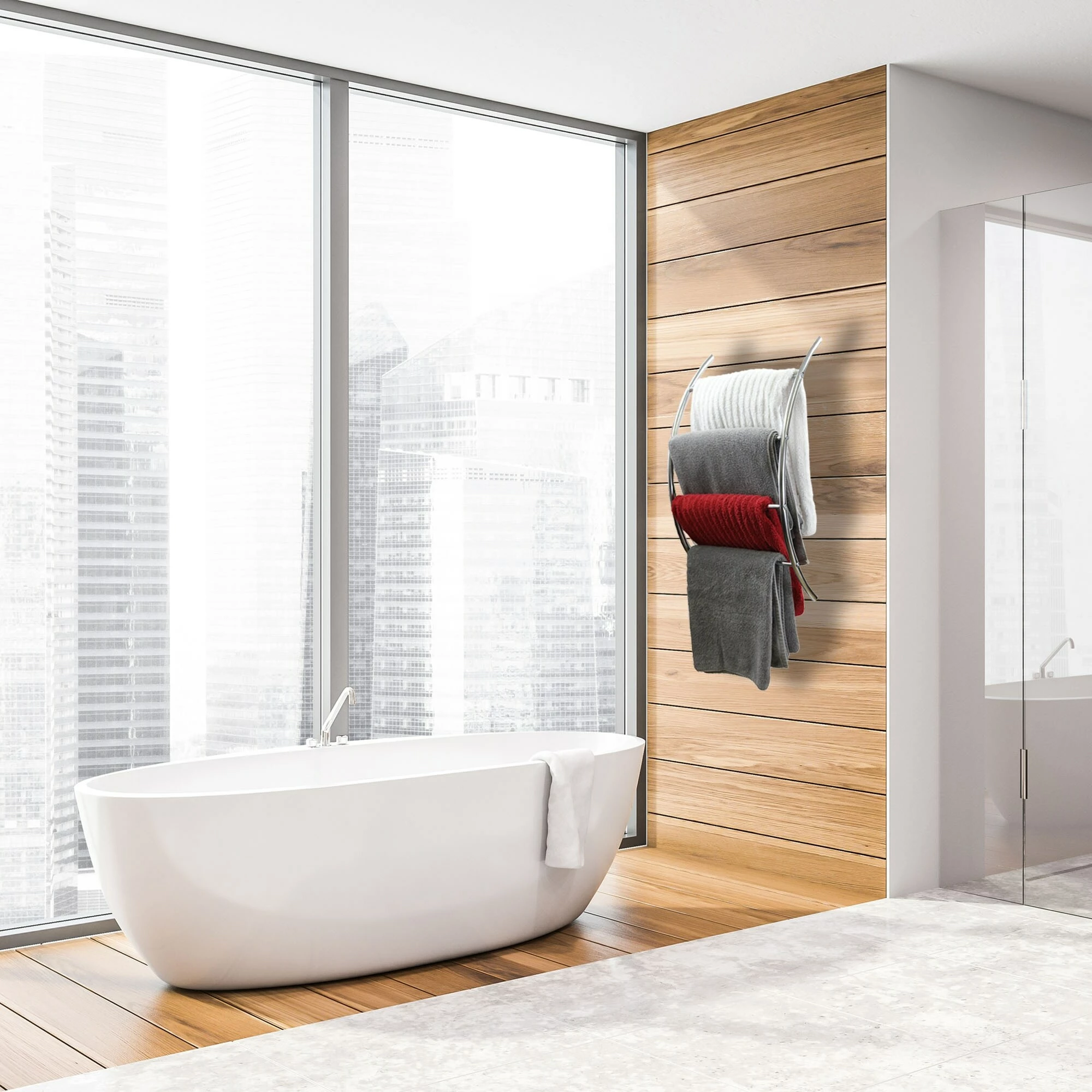 - NICE DESIGN : this slick modern chromed towel organizer in your bathroom adds a splash of unique style and functional convenience to your home, the simple but elegant curved ladder styling suits any room, laundry, toilets and bathroom