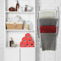 Need extra storage and a neat bathroom? Wet towels and bathrobes hanging over the tub edge or the shower rod create a very untidy look in the bathroom. They just don’t dry right unless they are hung up. Evideco bathroom towel hangers, ladders, hooks, and door hangers for towels will give you a dry towel the next time you need one. There is the added bonus of hooks acting as extra storage for a towel. If there’s no room for a robe in the closet, you can hang it on a hook. Evideco offers a large array of quality towel holders and hangers in a variety of designs and styles to match your home dΓ©cor and your own style. Choose from a freestanding towel rack tree, towel valet stand, wall mounted hooks, over-the-door hooks and racks or wall mounted shelves. Keep towels, robes, and other clothing off the floor and out of the way in the bathroom with towel hangers. Keep everything organized, neater and, most importantly, dry! Hangers and shelves for wet towels will help them dry faster and air them out.